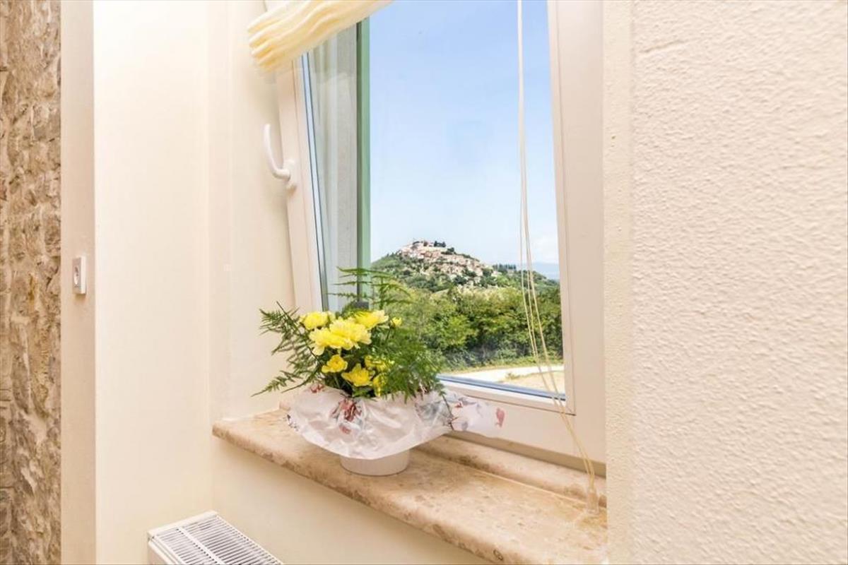 Középső szint: hall, két hálószoba, két fürdőszoba, tároló, terasz Motovunra néző kilátással.