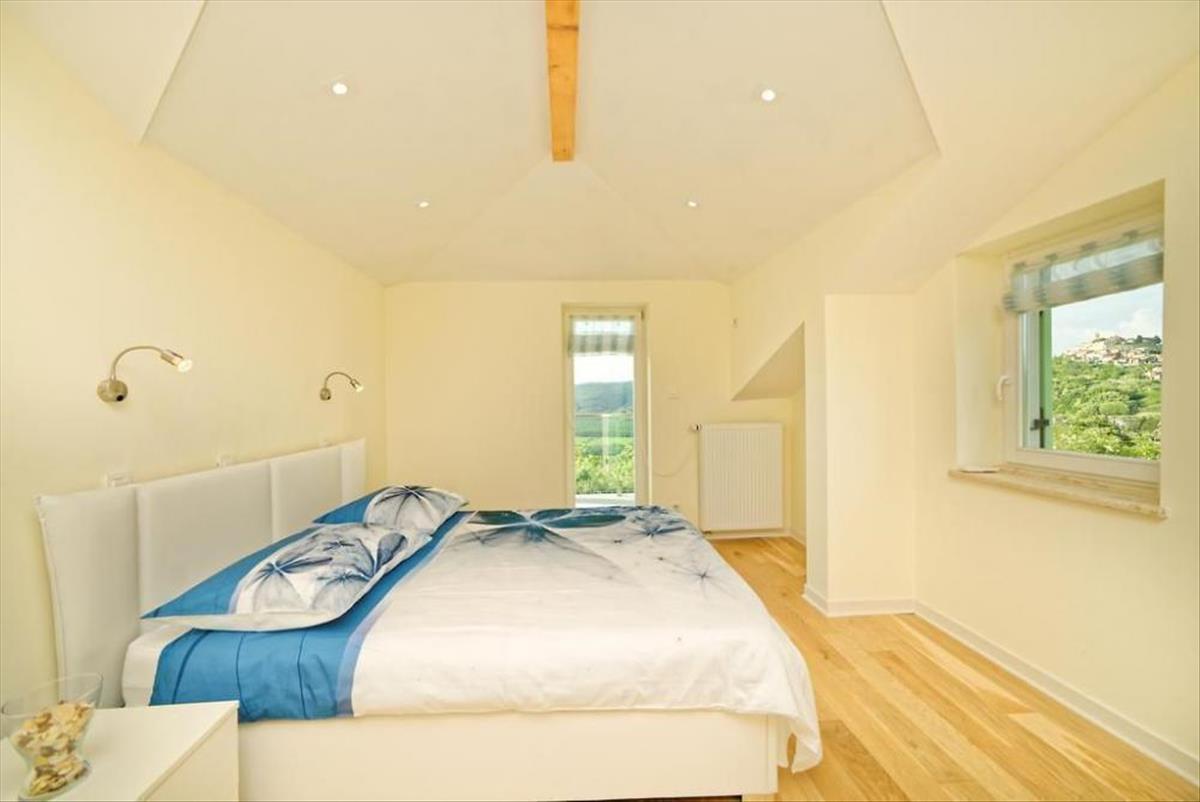 Felső szint: hall, két hálószoba, két fürdőszoba és terasz kilátással a Motovunra.