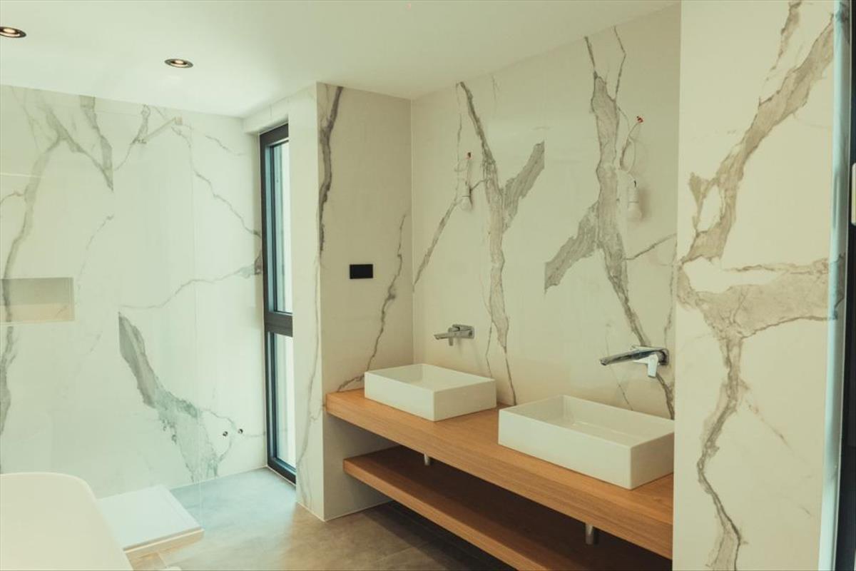 A villa elülső homlokzata egy tágas fedett terasszal büszkélkedhet, amely csodálatos tengeri tájat kínál, míg a hátsó tartományban egy 32 m2-es vízi menedék található, amelyet egy fedett bejárati terasz egészít ki. Ott előkészületeket találunk a környezeti világításra, egy nyári konyhára és egy szabadtéri zuhanyzóra. a lakrészek zökkenőmentes kapcsolata lehetővé teszi a könnyű hozzáférést mind az elülső teraszhoz, mind a medencéhez, megkönnyítve a kommunikációt minden nézőpontból.