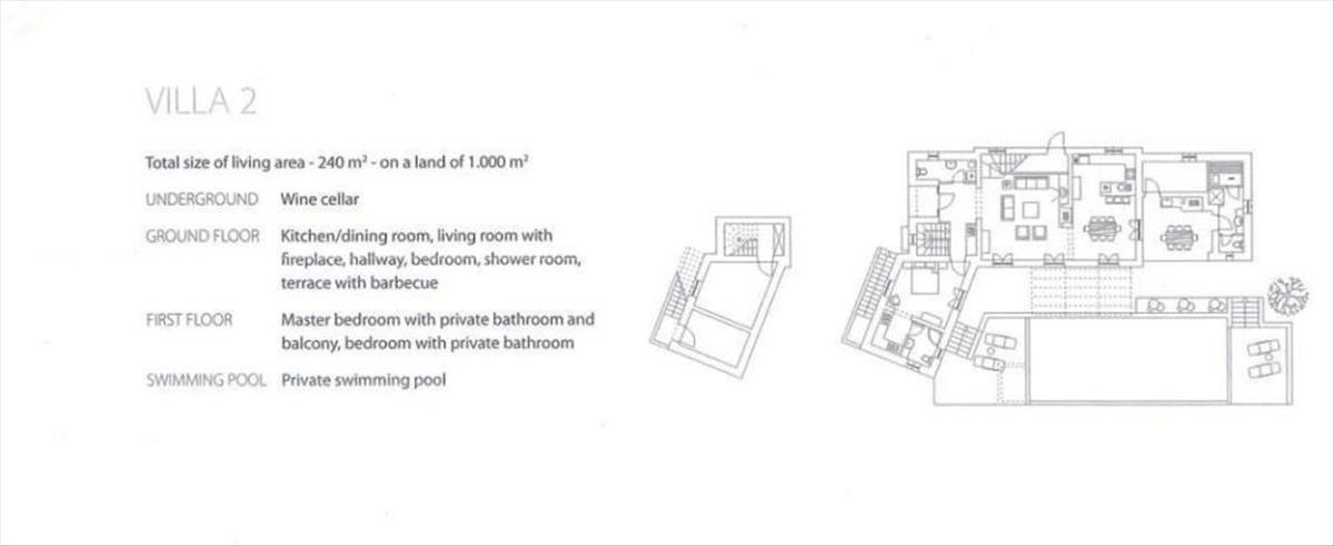 A villa földszintjén található egy nappali kandallóval a különleges hangulatért, egy konyha étkezővel, egy hálószoba, egy fürdőszoba és egy terasz. Az első emeleten 2 hálószoba található saját fürdőszobával és terasszal.