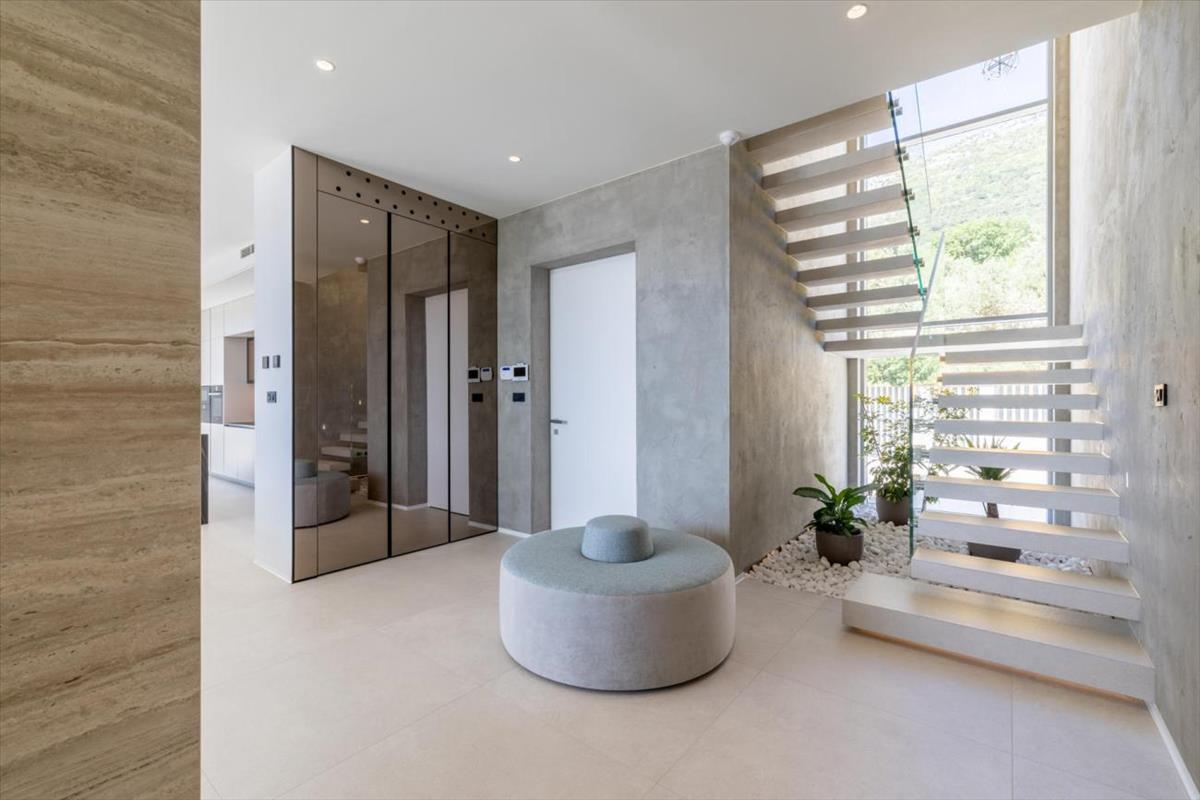 A villa belső terében öt tágas hálószoba található, mindegyik saját fürdőszobával, egy plusz vendég WC-vel, valamint egy elegáns nappalival, amely egy modern felszerelt konyhához és nyitott étkezőhöz kapcsolódik. a nappaliból egy tágas teraszra vezet az út, amely ideális a mediterrán életstílus élvezésére, luxus grillezővel, végtelenített medencével, napozóterasszal és jakuzzival van felszerelve, mindez lélegzetelállító kilátást kínál.