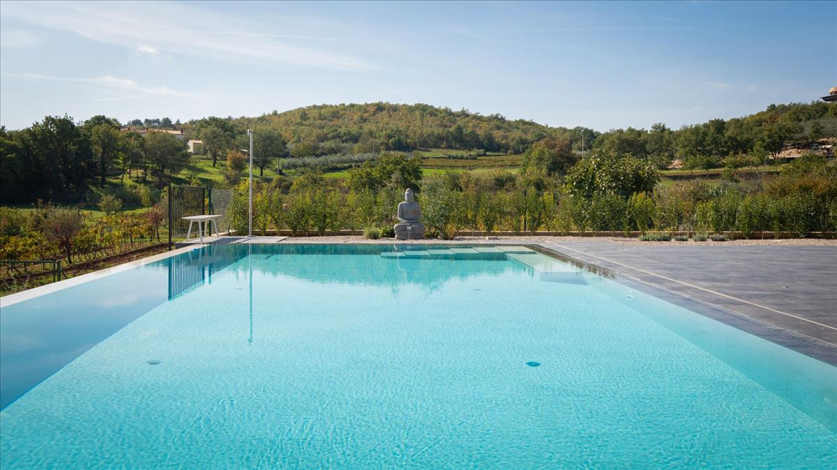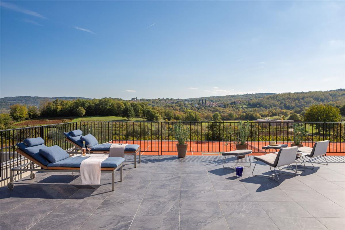 A birtok lakókoncepciója úgy lett megtervezve, hogy harmonizáljon a környező mediterrán környezettel, lélegzetelállító panorámás kilátást kínálva Motovunra és a vidékre. a belső tér prémium anyagokkal büszkélkedik, amelyeket neves tervezők és bútorgyártók szállítottak, a kialakítás pedig zökkenőmentesen ötvözi a kényelmet és a kifinomultságot. a tágas, világos szobák igazán hívogató légkört teremtenek, azonnal elvarázsolva minden vendéget.