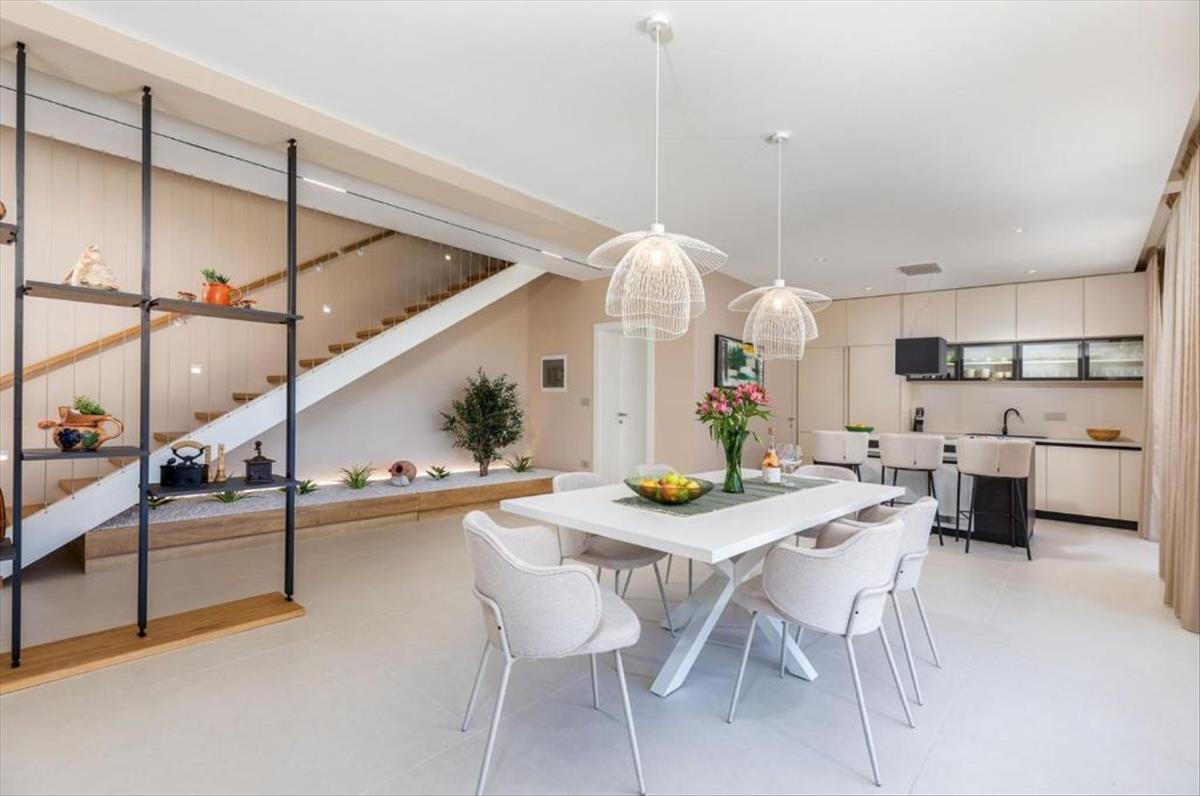 A két szintet átívelő belső koncepció a funkcionalitást, a nyitott alaprajzot és a légkört helyezi előtérbe. a bőséges üvegfalak zökkenőmentes kapcsolatot teremtenek a külvilággal, míg a prémium szerelvények és az aprólékosan megválasztott modern bútorok elegáns és esztétikus, kényelemmel teli hangulatot ápolnak.