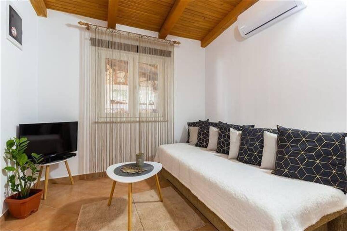 Egy kisebb, 50m2 összterületű ház egy konyhás nappaliból, két hálószobából és egy fürdőszobából áll. a ház teljesen bútorozott. Előtte van egy nagyon szép közös taverna a társasági élethez. Fedett, konyhával és kandallóval felszerelt, összterülete 26 m2.