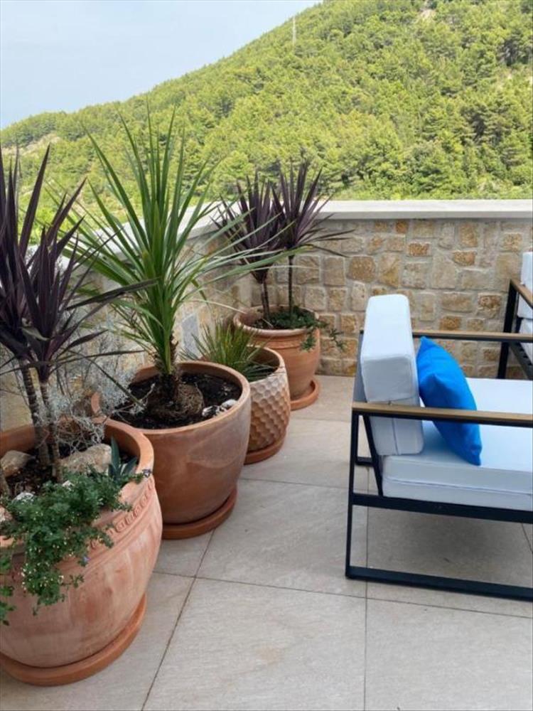 Az első emeleten egy fürdőszoba és egy nyitott konyha, étkező és nappali található, amely hozzáférést biztosít egy 20 m²-es teraszhoz, ahonnan festői kilátás nyílik a tengerre és a hegyekre.