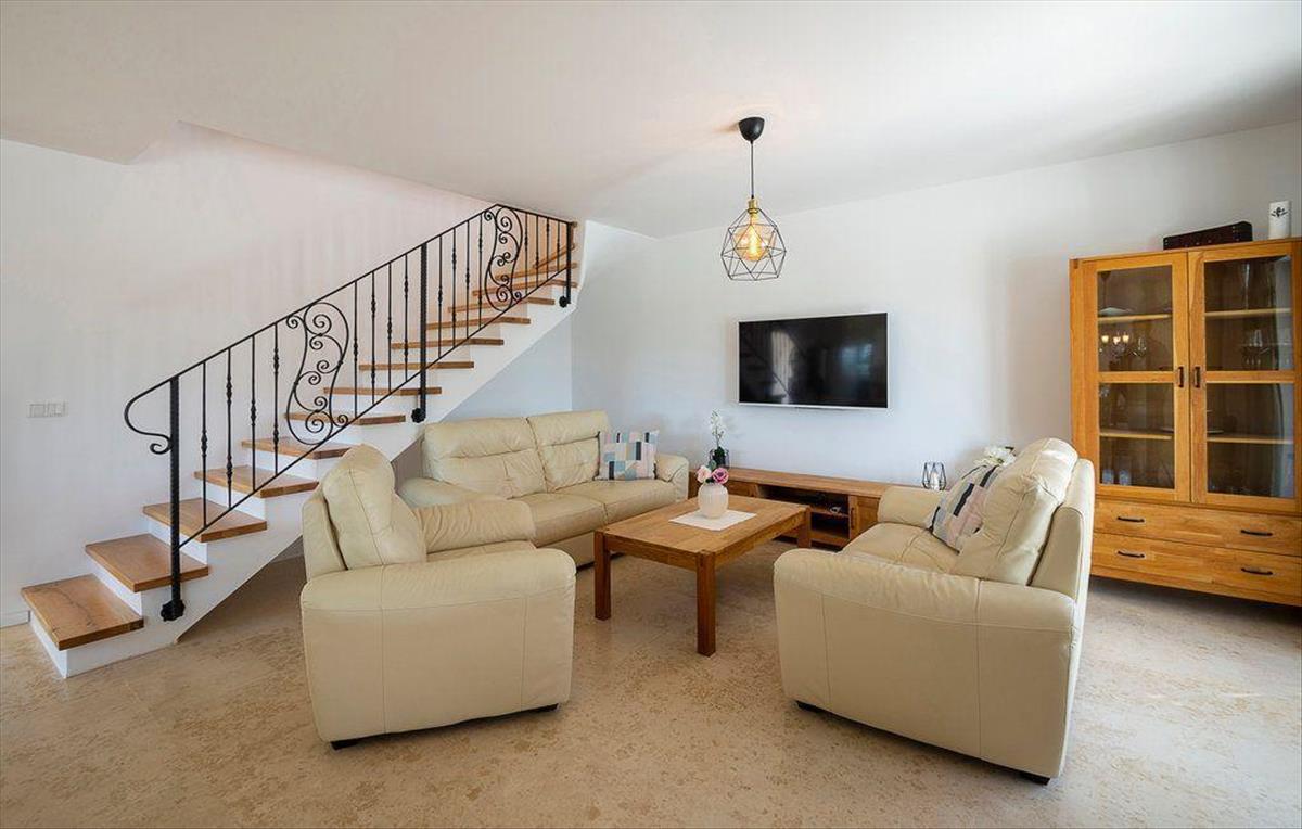 A földszinten egy bejárat található egy gardróbrésszel, amely egy természetes fénnyel teli, nyitott kialakítású lakótérbe vezet. Ez a terület tartalmaz egy modern, teljesen felszerelt konyhát szigettel, egy tágas étkezőt, amely elég nagy az egész család számára, és egy kényelmes nappalit, ahonnan elérhető a medence és a fedett nyári terasz. Ezen kívül a földszinten található egy hálószoba, egy vendégfürdőszoba és egy mosókonyha, mosókonyhával.