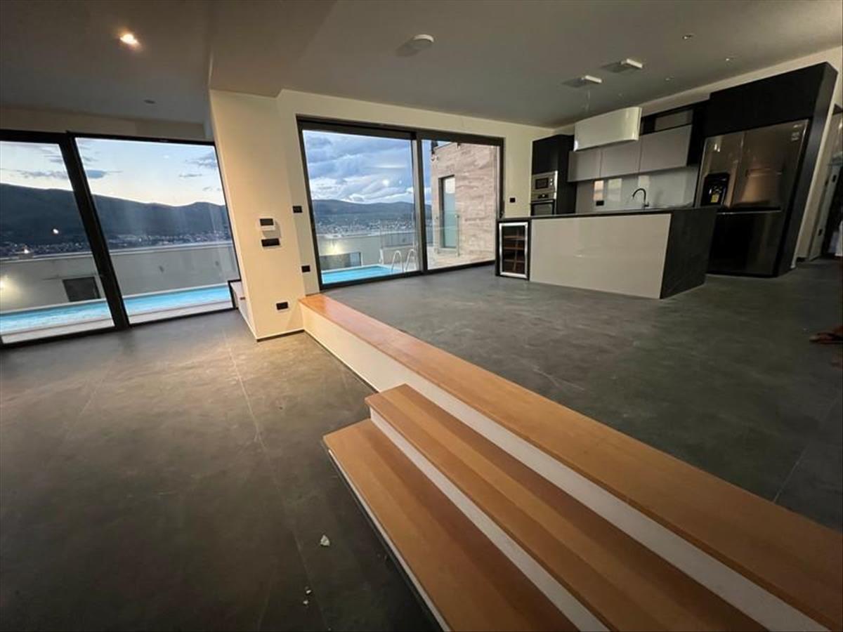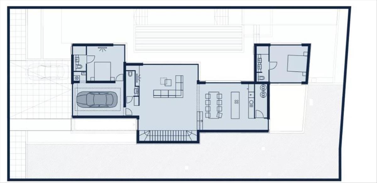 A minimalista belső teret éles téglalapok és minimalista formák uralják, összhangban a modern építészettel. a padlók értékes 120x240 cm-es kerámia csempével és fa padlóval burkoltak. a rejtett keretes ajtók, valamint a nagy formátumú ablakok előlapjai ideálisan illeszkednek a villa kiemelkedő modern dizájnjának mintájába.