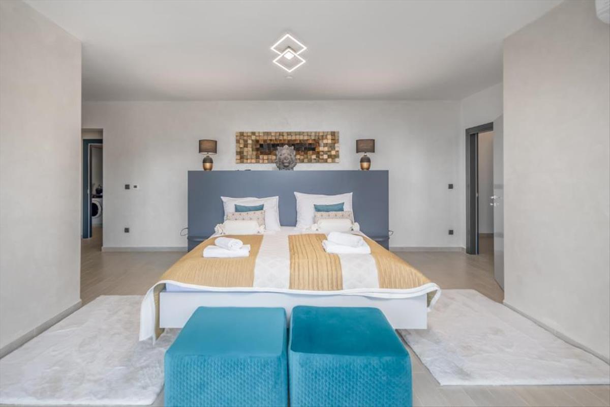 Prémium jellemzők és infrastruktúraBőséges terület: a villa egy tágas telken helyezkedik el, amely gondozott gyepet, mediterrán zöld növényzetet és egy biztonságos privát bejáratot tartalmaz.