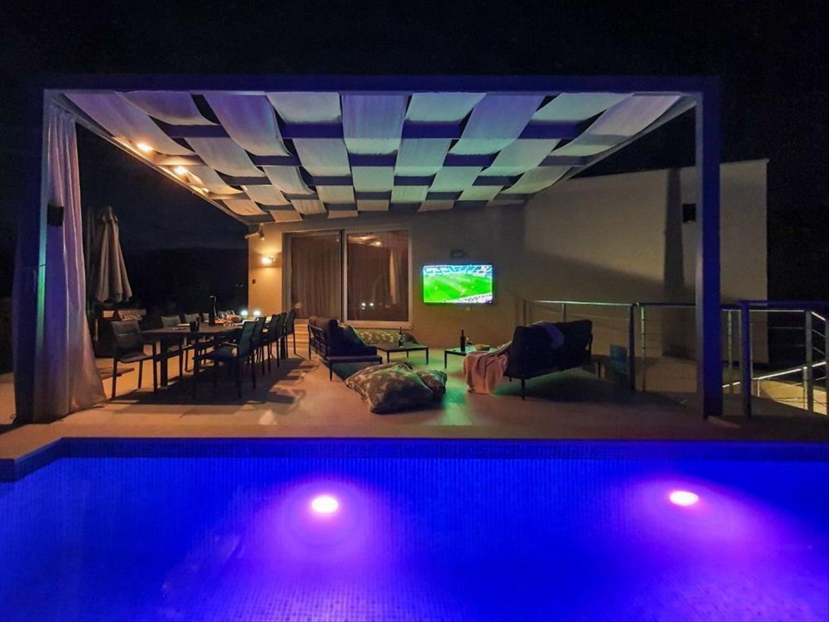 Kiérve a teraszra a gyönyörű kilátással rendelkező fűtött uszodába (22m2) jutunk, az uszoda mellett grillező, tv és komplett hangosítás is található.