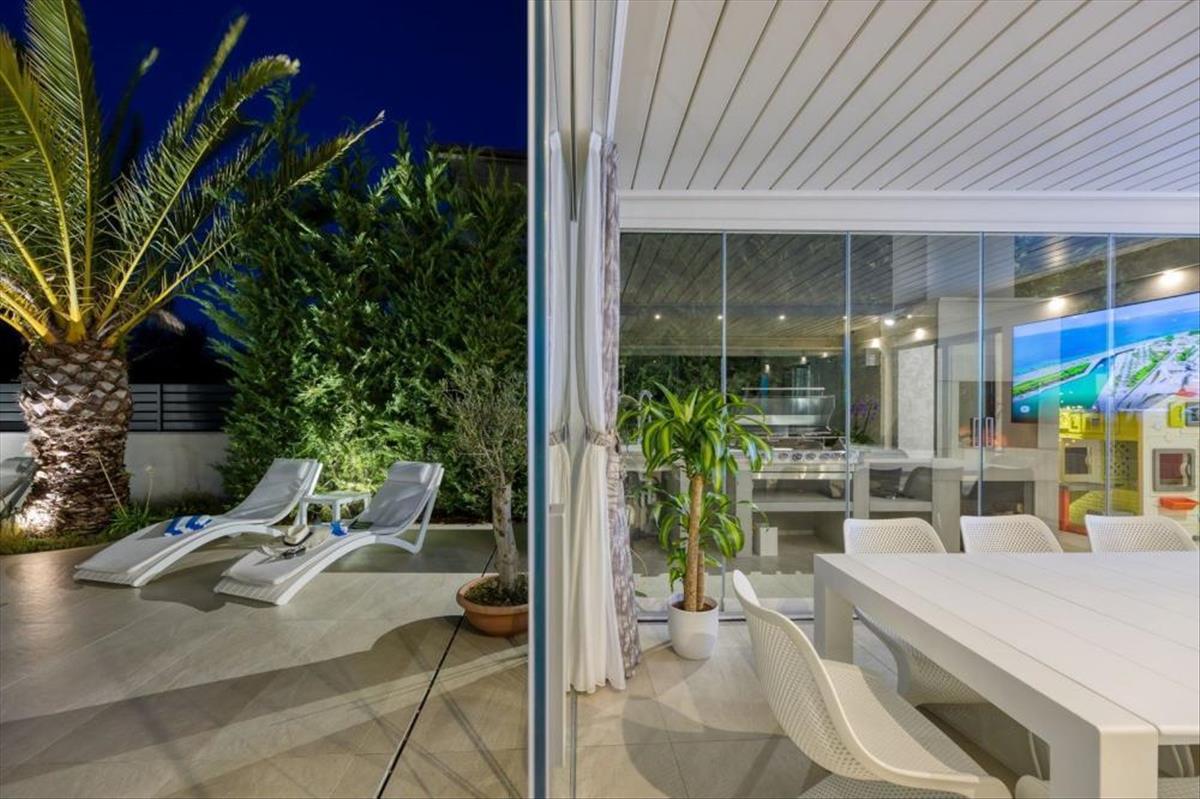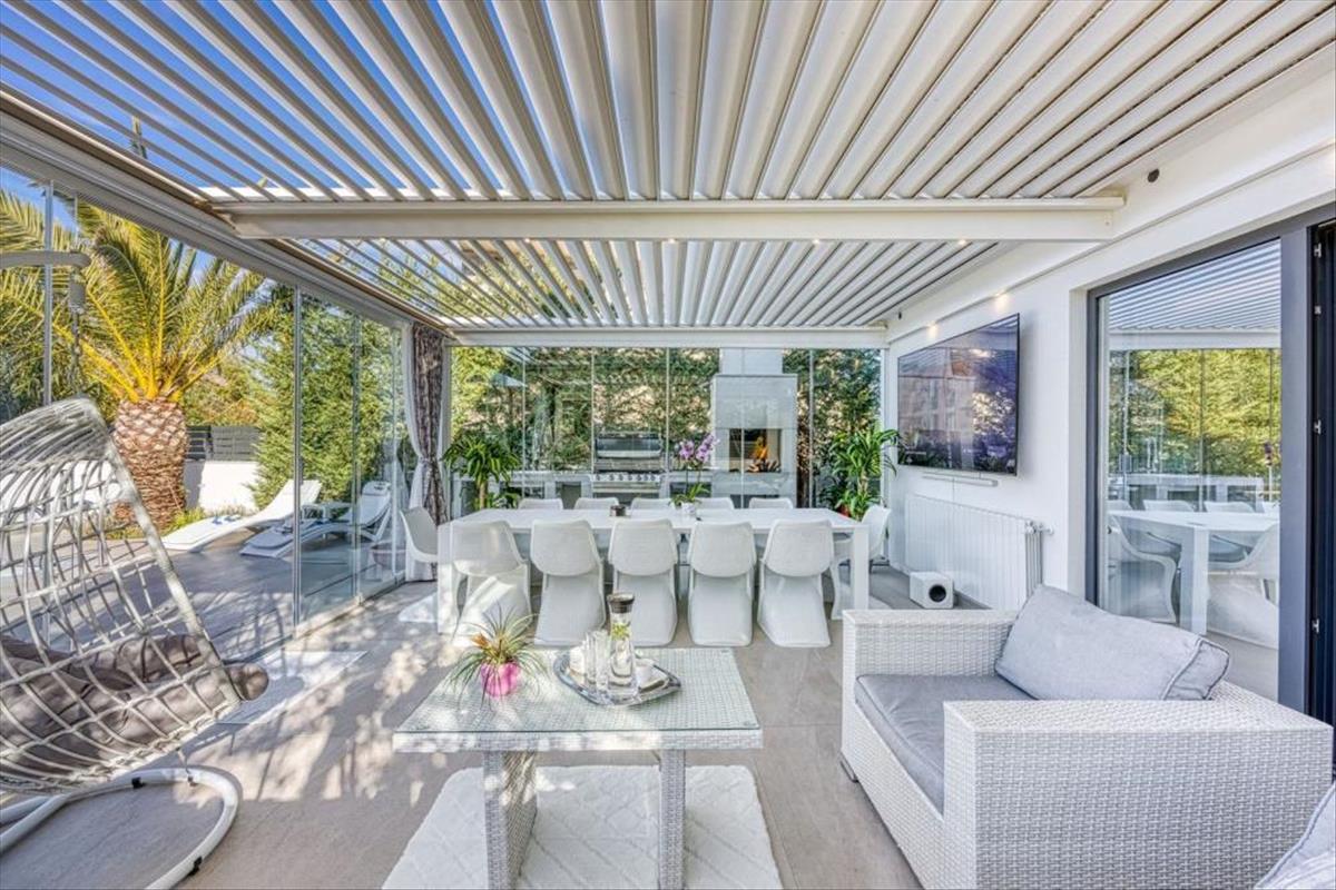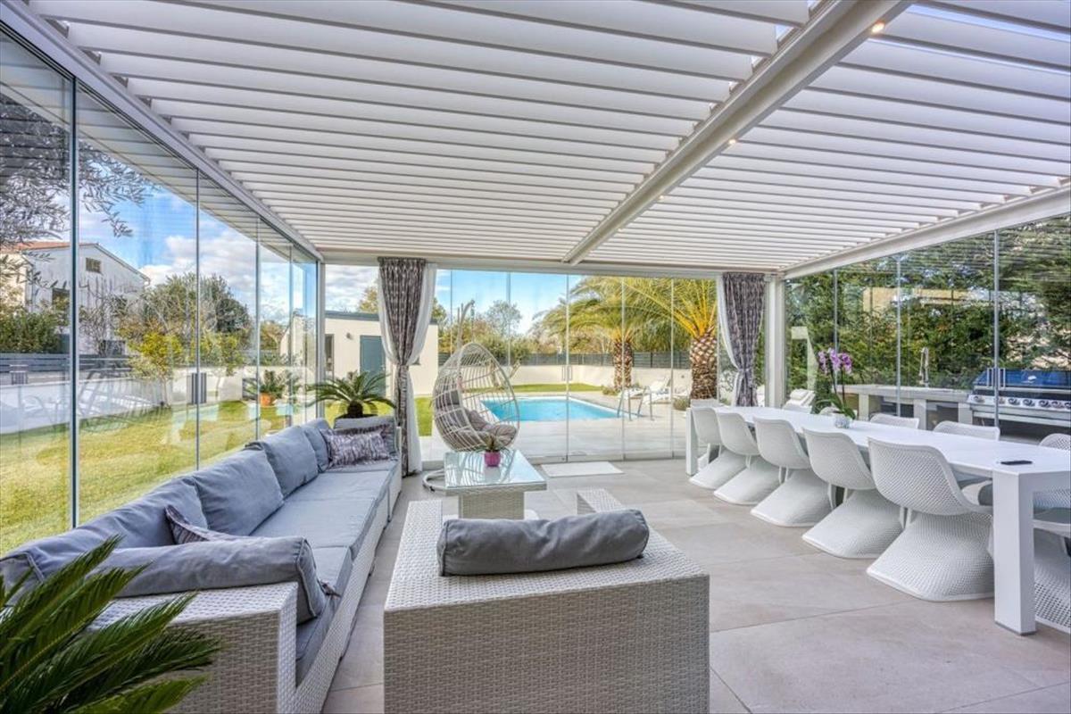 A villában való tartózkodás fokozása érdekében a tulajdonosok zseniálisan kiterjesztették a konyhán keresztül egy nagyobb fedett kültéri teraszra, amelyet nagy tolóajtókkal díszítettek. Ezek az ajtók teljesen zárhatók, így a terasz a fűtési lehetőségeknek köszönhetően akár a téli hónapokban is használható, a melegebb hónapokban pedig teljesen kinyitható, így kiváló minőségű kültéri teret alakítanak ki, amely közvetlen összeköttetést biztosít az udvar többi részével és a tágas terekkel. Medence.