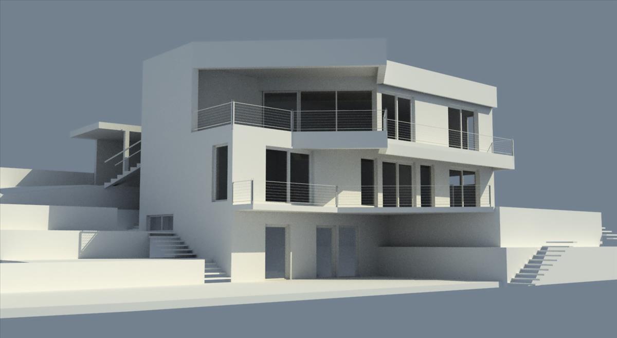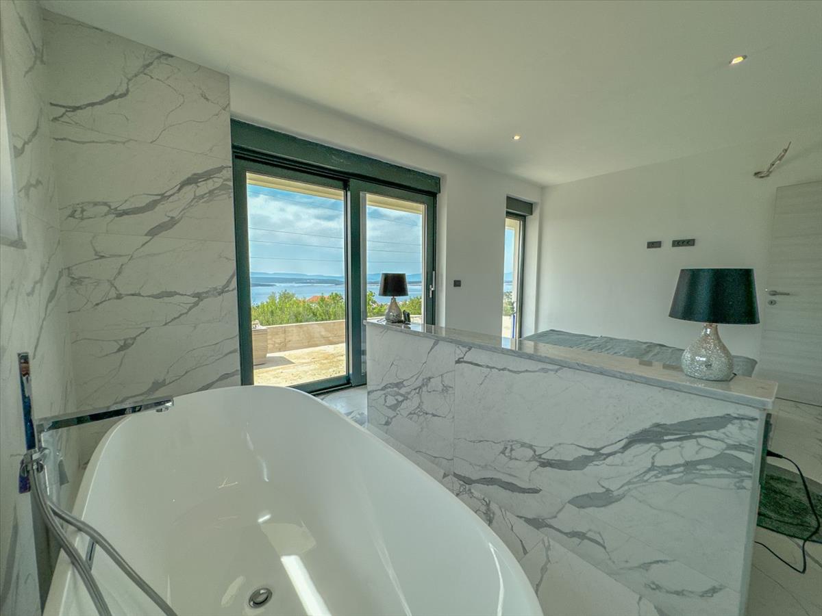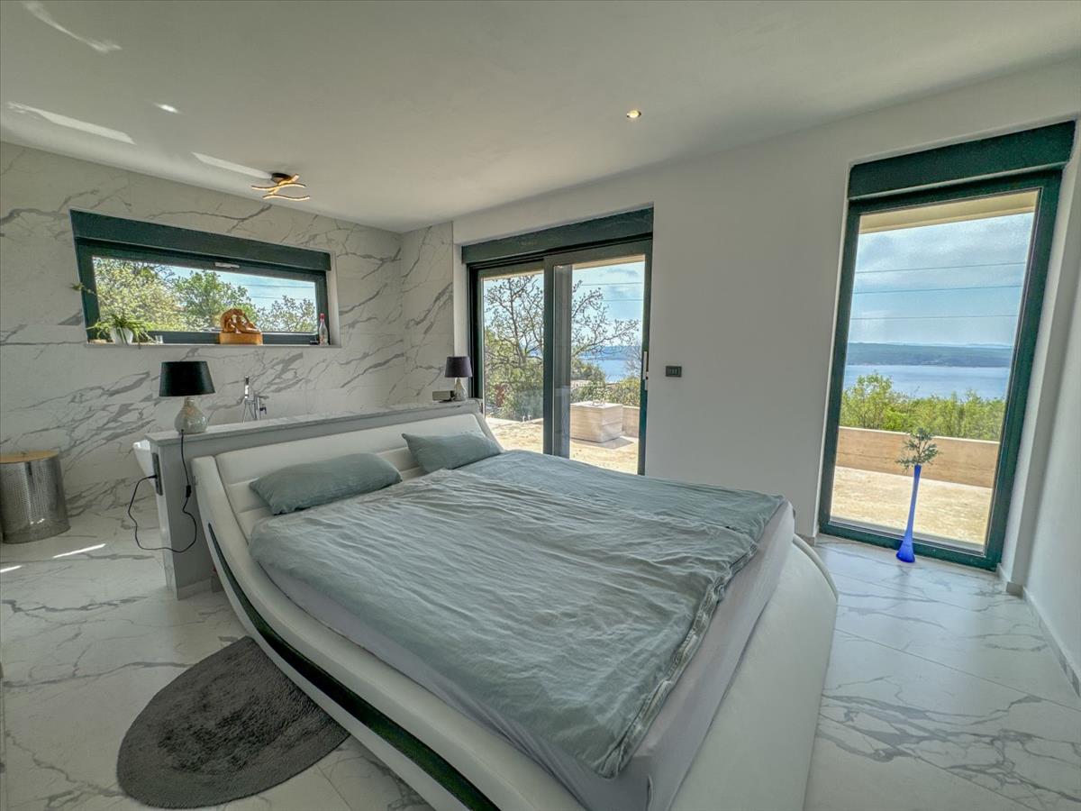 A villa egy kiváló helyen található Crikvenica felett, panorámás kilátással a tengerre és a környező szigetekre. Három szinten terül el, a bejárat a legfelső emeleten található, ahol egy tágas, nyitott nappali, konyha és étkező található, összesen 66 m²-en, egy kis fürdőszoba és egy tökéletes, 30 m²-es, déli tájolású terasz. Figyelemre méltó jellemzője a 70%-át borító üvegfal, amely bőséges természetes fényt enged be. Az üveg napenergia-szabályozással van ellátva, ami a befektető részletgazdagságára utal.
