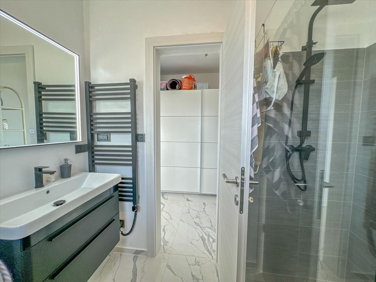 Belső lépcső vezet le a privátabb középső szintre, ahol három hálószoba található, 16 és 18 m²-esek, mind déli tájolásúak, teraszra és medencéhez való hozzáféréssel. a kialakítás kivételes, az egyik hálószoba a fő hálószoba saját fürdőszobával, míg a másik két hálószoba egy nagyobb fürdőszobát oszt meg. a terasz (22 m²), a medence (22 m²) és a napozóterasz ideális helyet biztosít a pihenésre és a kikapcsolódásra.