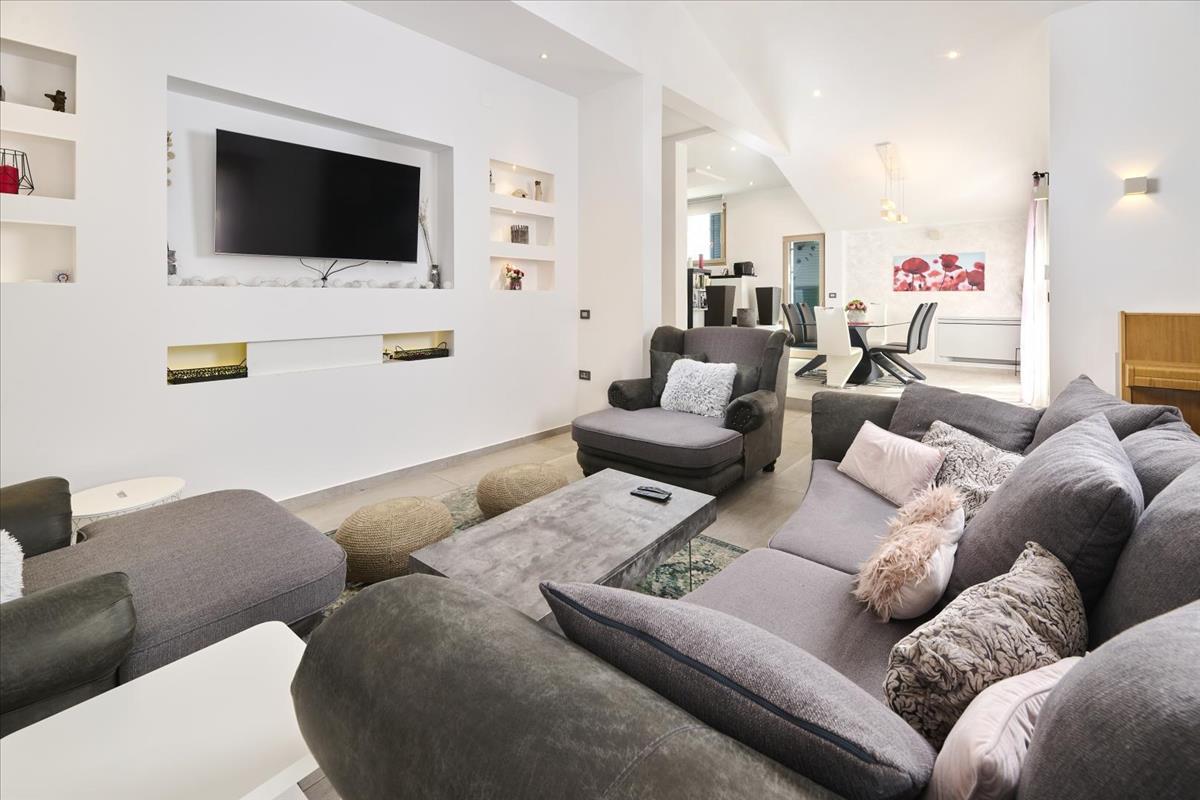 Fedezze fel a mediterrán luxus mesterkurzusát ezzel a tágas tervezői villával, amely eladó Umagban, Horvátország Adriájának egyik legelőkelőbb kapujában.
