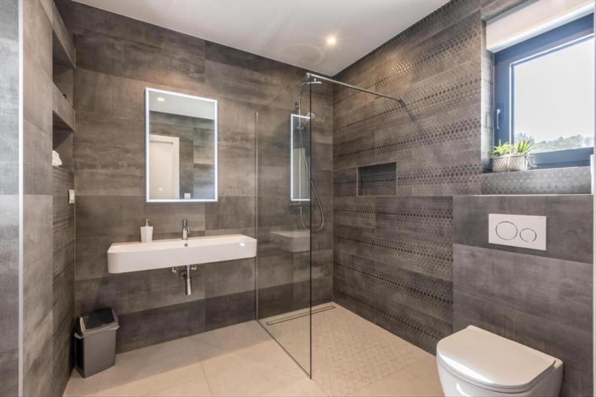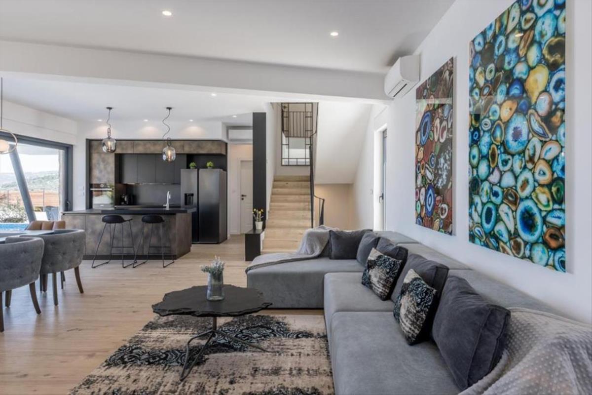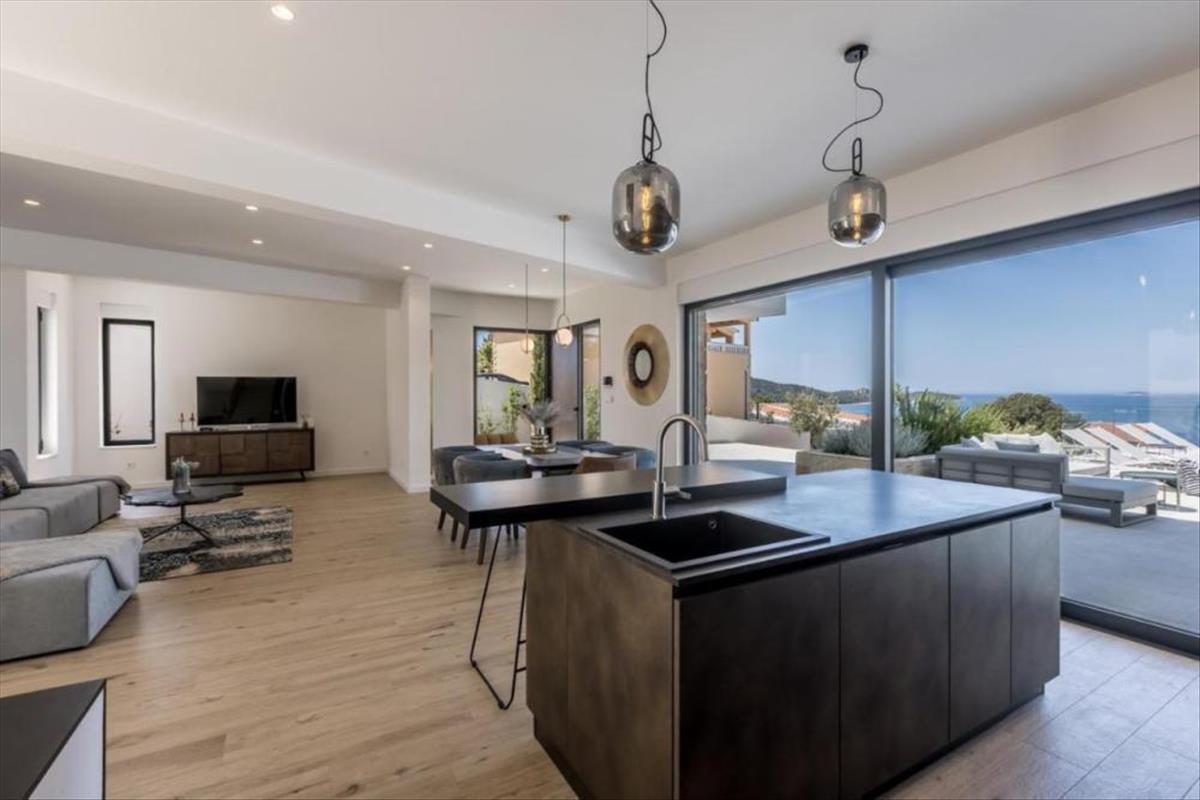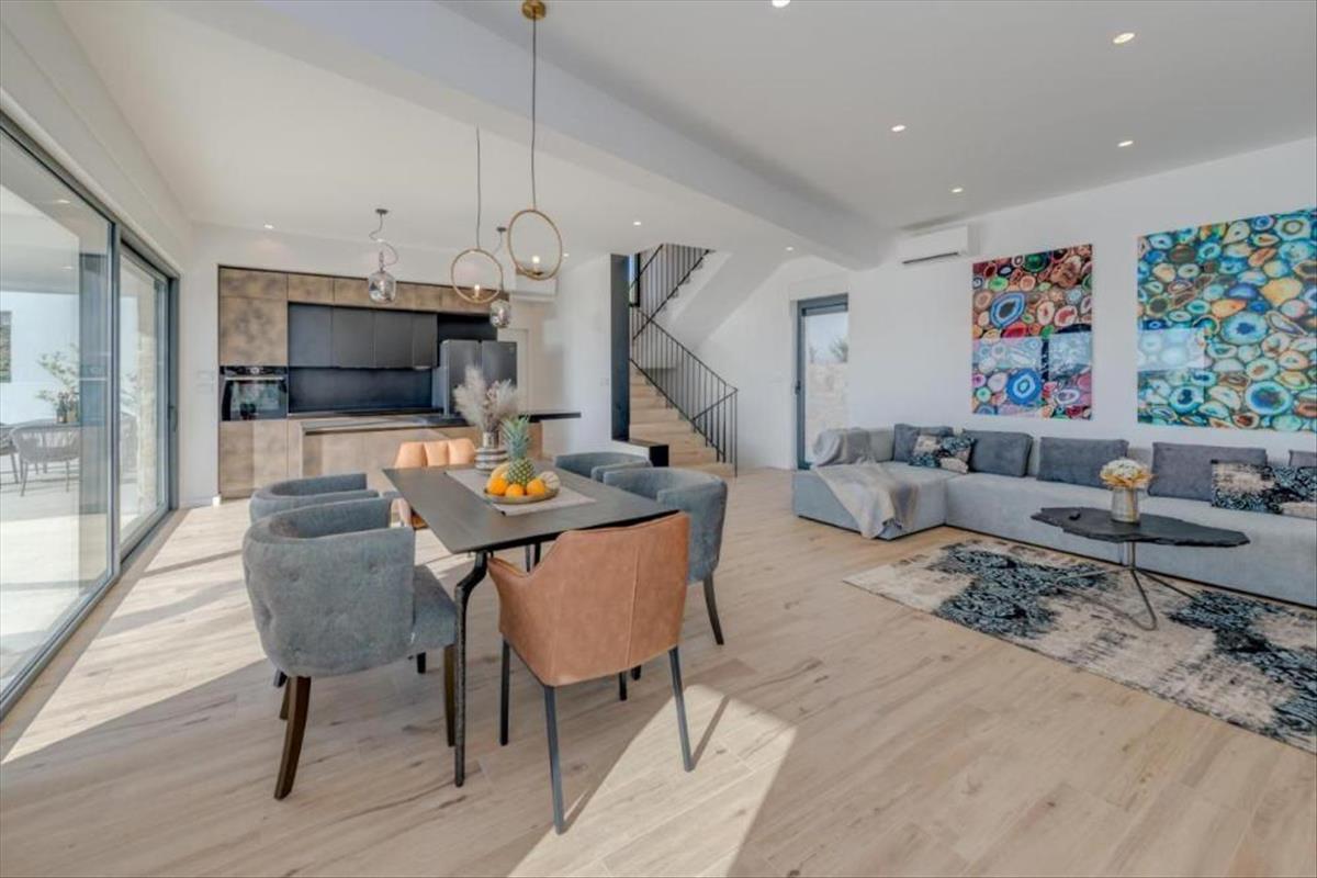 Ez a villa összesen 270 négyzetméterrel büszkélkedhet három szinten. a földszinten tágas nappali, modern konyha, étkező enklávé és diszkrét mosdó várja a vendégeket. a lakóterek egy tágas teraszig terjednek, ahol egy csábító medence hívogat a társalgó mellett, elsöprő látványt nyújtva az azúrkék tengerről és a szétszórt szigetekről.