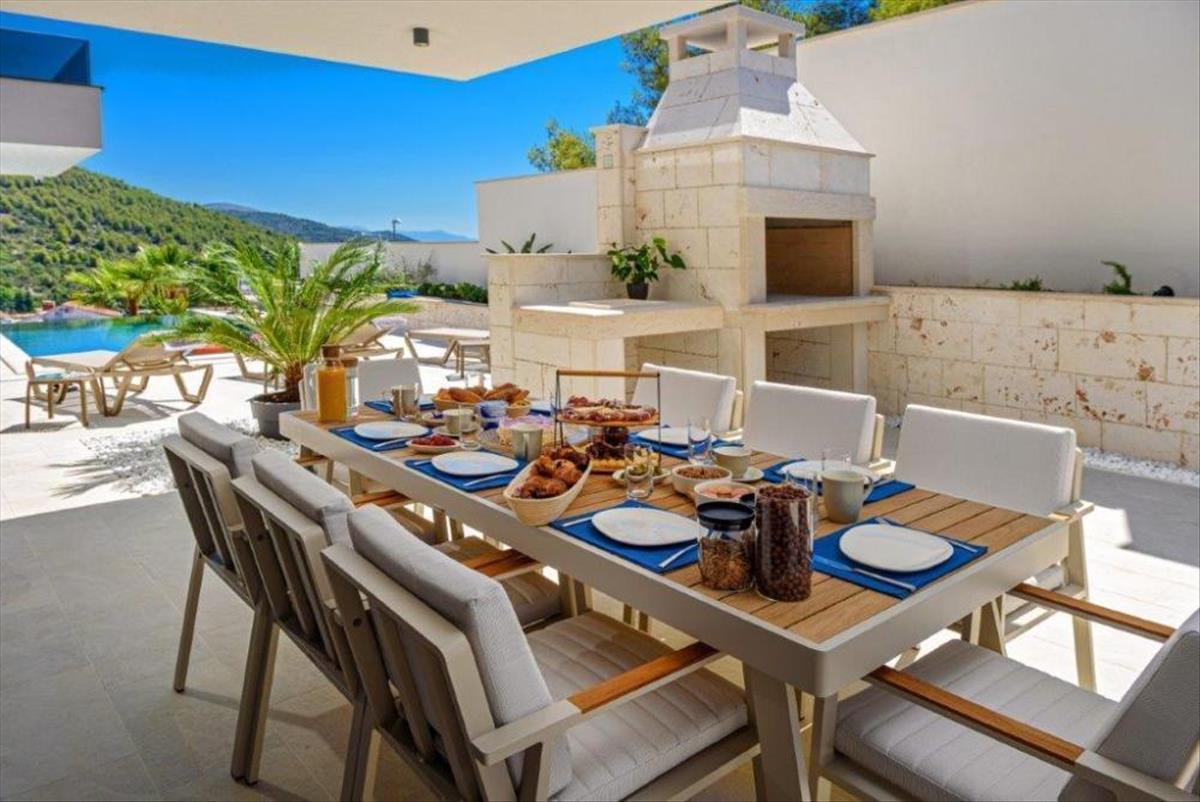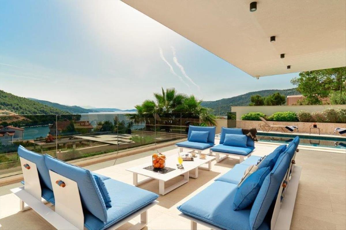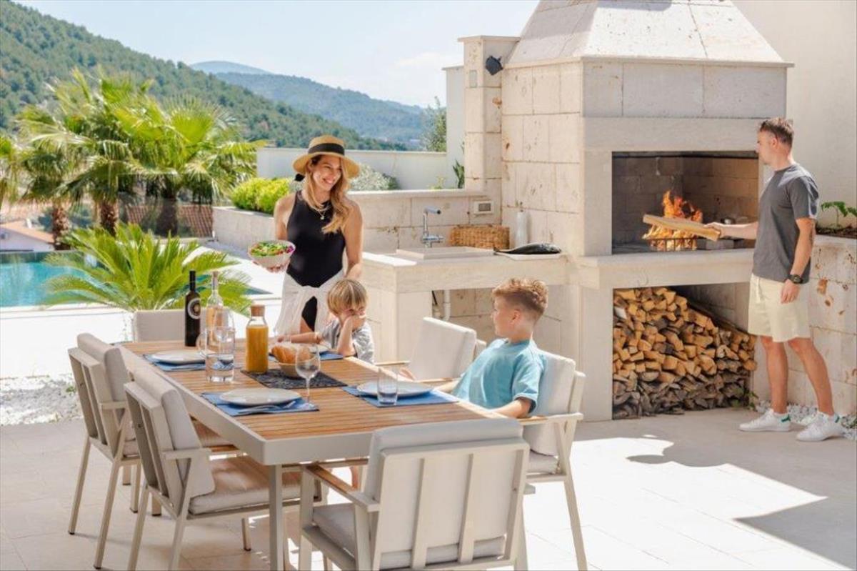 A kiváló villa előtt tágas teraszon szabadtéri, fűtött, végtelenített medence található, ahonnan lenyűgöző kilátás nyílik a tengerre és Split városára. a további szolgáltatások közé tartozik a szabadtéri grill, az edzőterem, a szauna, a gyermekrészleg és a fitneszközpont.