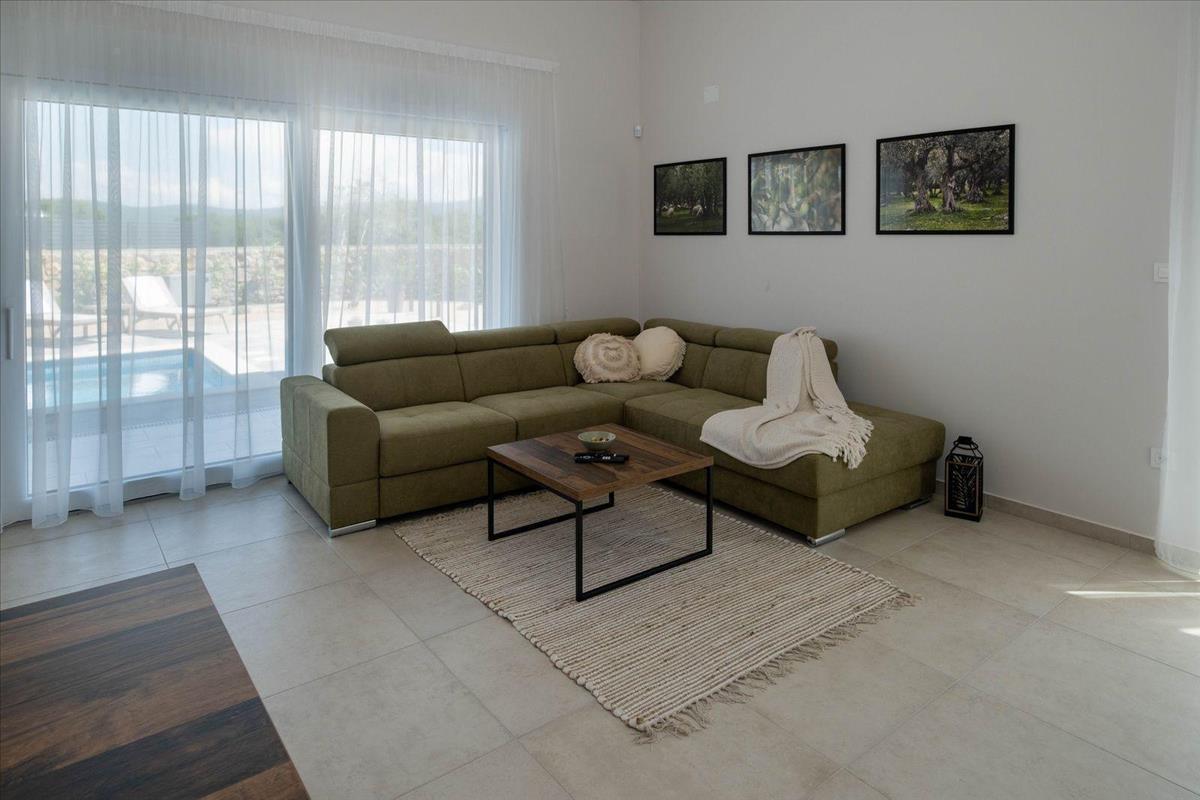 A kültéri terület teljesen bekerített és gyönyörűen gondozott, magánéletet és pihentető mediterrán légkört kínál. a kert automatikus öntözőrendszerrel és stílusos fűtött medencével rendelkezik, tágas napozóterülettel, amely tökéletes a meleg adriai éghajlat élvezetéhez. Számos privát parkolóhely található a villa mellett, biztosítva a lakók és vendégek kényelmét.