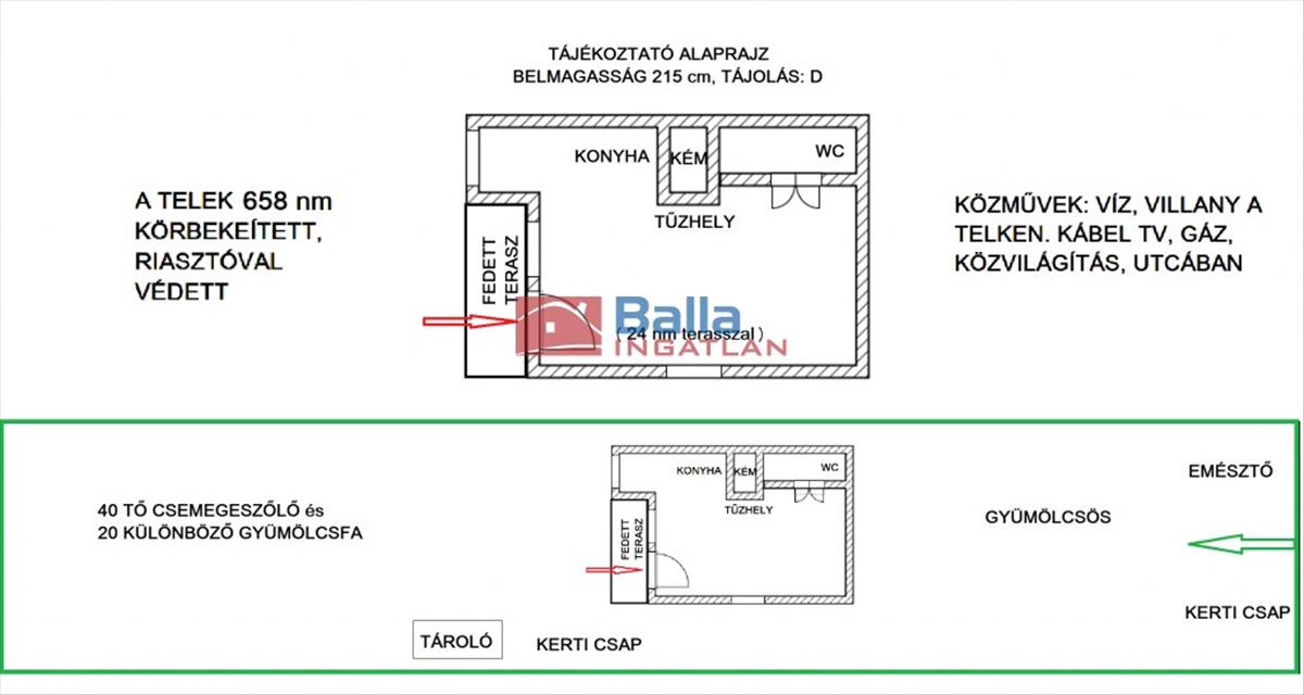 A panorámás telek vízszintes, felső szakaszán található a ház, ami 24 nm. a konyhát és a mellékhelyiséget már kialakították, kéménye is van, beüzemelt teatűzhellyel. a szennyvíz elvezetése emésztőbe megy, a víz bekötése a házba könnyen megoldható. Az utcában gáz, kábel tv, közvilágítás megoldott. Áram a házba bevezetve, működő riasztó is van. a telken van még egy tároló, két kerti csap, valamint esővíz gyűjtésére alkalmas tartályok is. a telek déli lejtős része szőlővel (kb. 40 Tő, vegyes csemegeszőlő) és termő gyümölcsfákkal beültetett, a telek felső, vízszintes részén gyümölcsfák vannak. Összesen mintegy húsz fa található a telken, köztük egy hatalmas germersdorfi cseresznye, kerepesi körték, őszi és kajszibarack, szilvák, meggy, fügefa, mandula, diók…