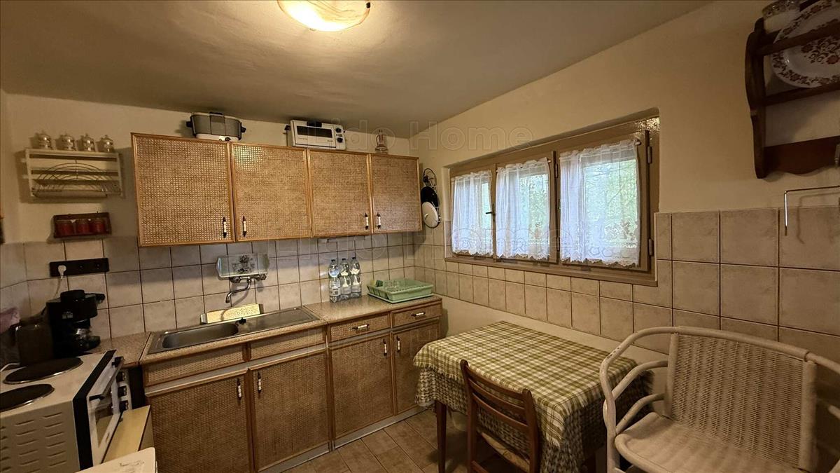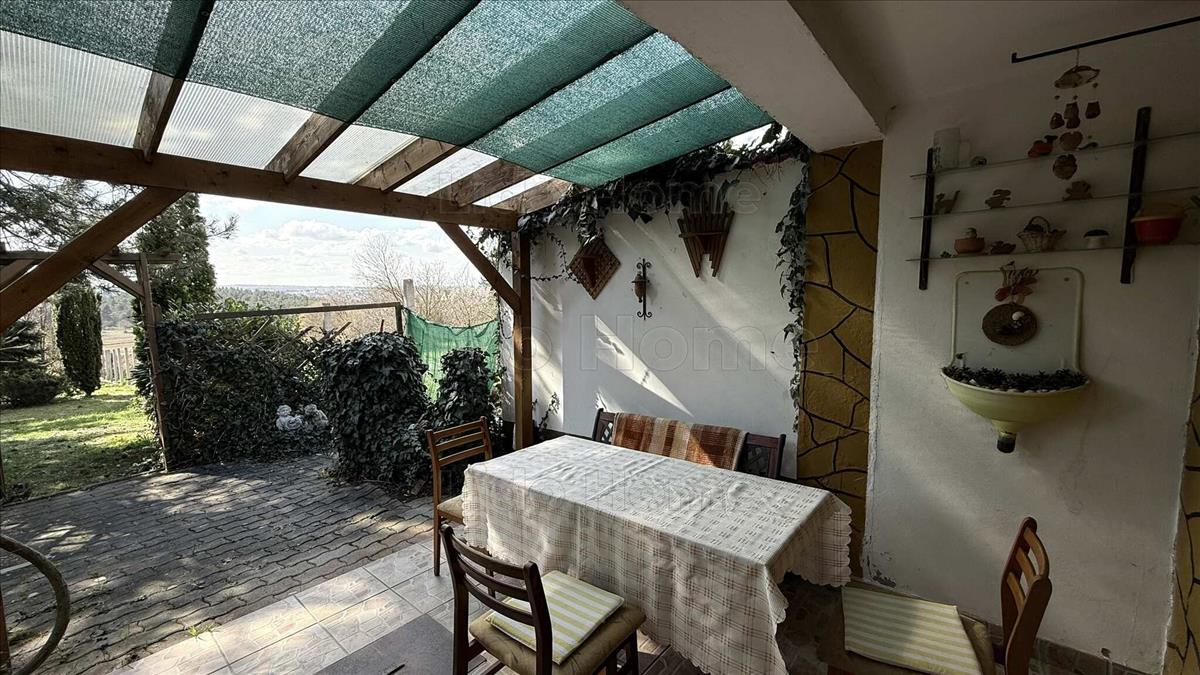 A földszinten nappali, konyha, fürdőszoba WC‑vel és egy fedett terasz található. a nappaliból lépcső vezet az emeletre, ahol két szoba és egy erkély kapott helyet — innen és az udvarból is szép tájpanoráma nyílik. a fűtést hősugárzó, vegyestüzelésű kályha és klíma biztosítja, a meleg vizet villanybojler adja. Az ingatlan víz‑, csatorna‑ és villanybekötéssel rendelkezik, a gázcsonk a telken található.