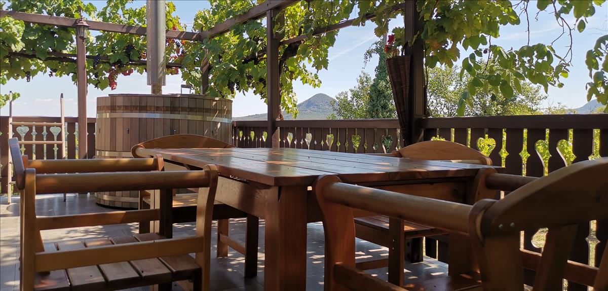 A főbejárat egy hatalmas teraszon keresztül nyílik, ahol jelenleg egy dézsafürdő, egy pizzasütő kemence és egy nagy asztal padokkal is el lett helyezve. (Ezek nem tartozékai az ingatlannak, de megvásárolhatóak. )