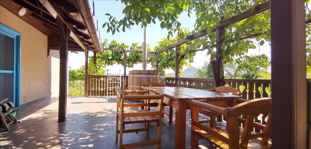 Eladó a Szent György-hegy keleti oldalán egy 2642 m2-es telken álló, 90 m2-es, szépen felújított, tanúhegyekre panorámás nyaraló.
