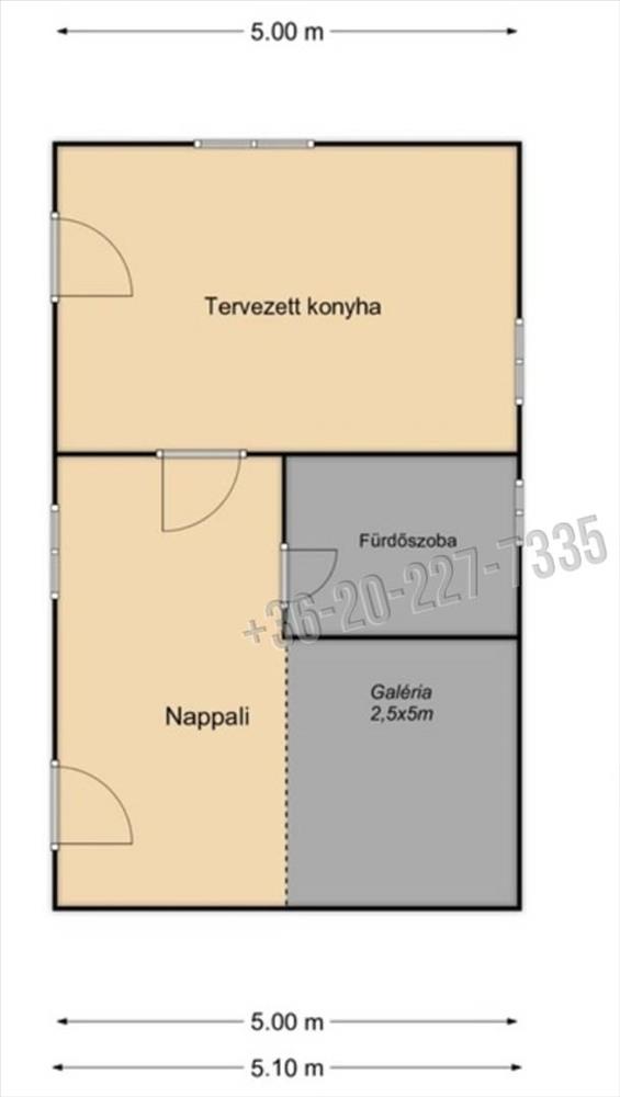 A nappaliban egy 12, 5 m²-es galéria (2, 5×5 m), amely hálószobaként funkcionál.
