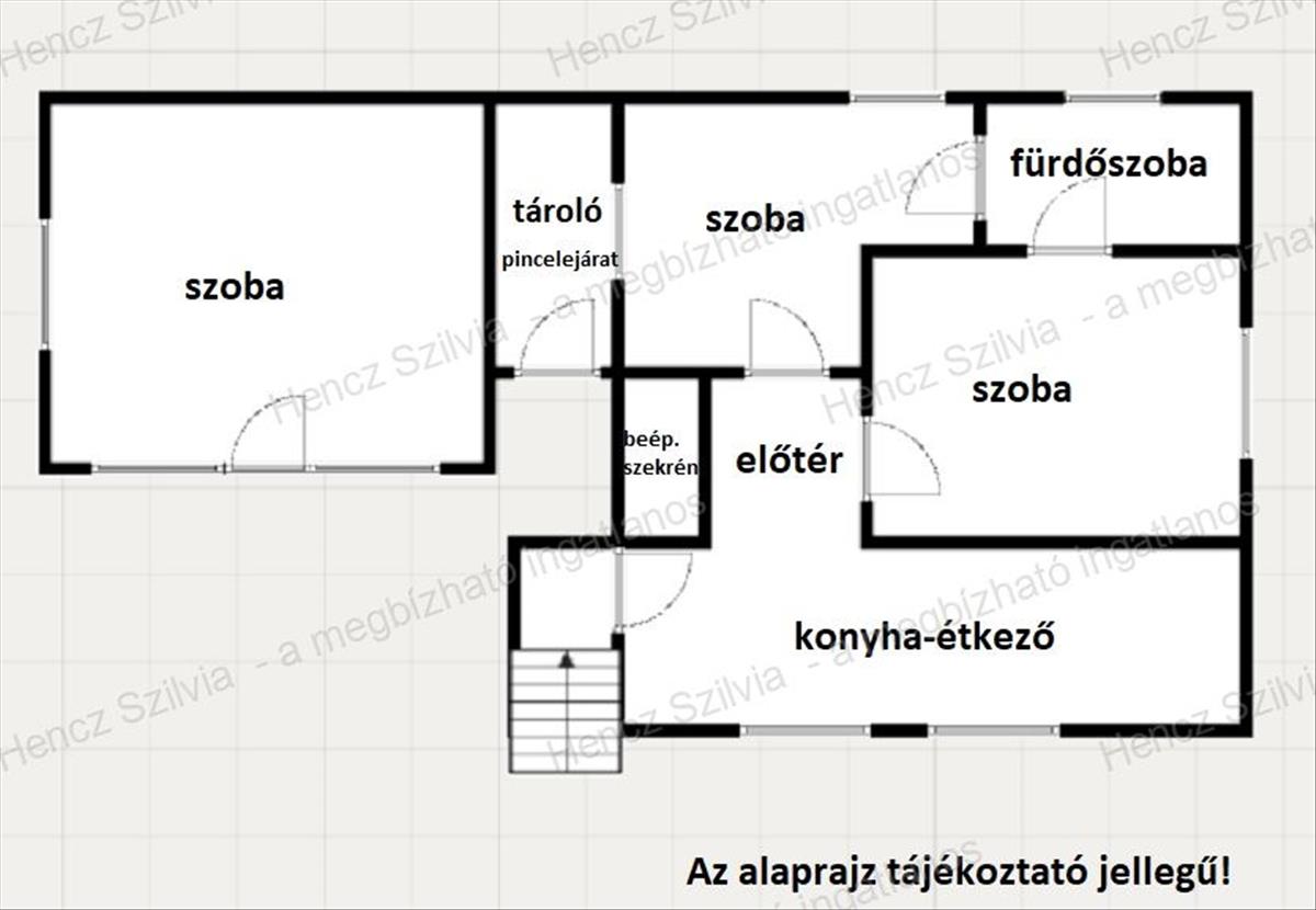 - Belső elosztás: Előtér, konyha-étkező, 3 különálló szoba, zuhanyzós fürdőszoba + WC.