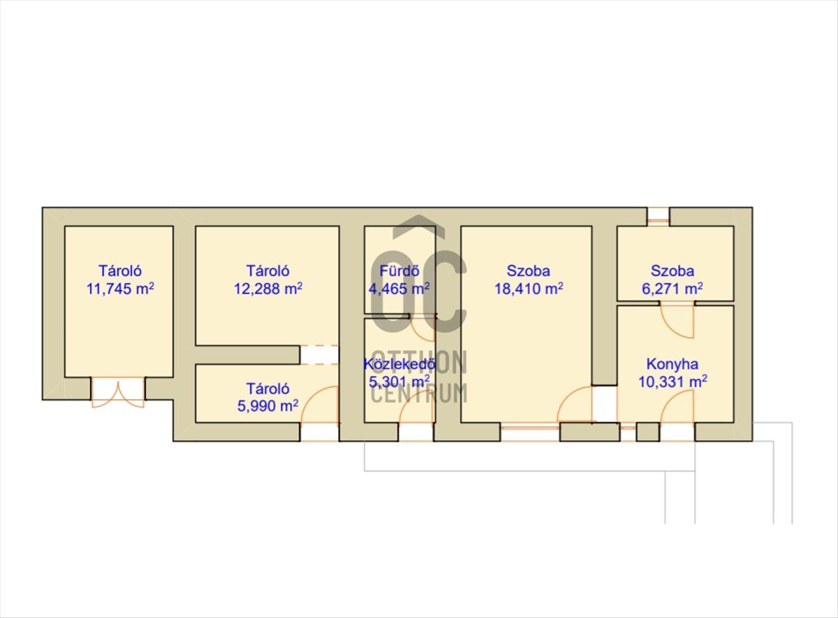 Egy nagy lakószoba és egy kisebb hálószoba mellett konyhát, fürdőszobát és 3 tároló helyiséget találunk benne.