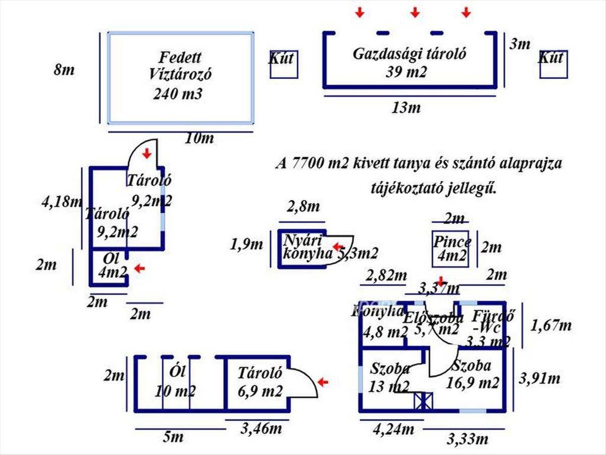 Bács-Kiskun vármegye, Lajosmizse külterületén kivett tanya és szántó megnevezésű ingatlan 45 m2 hasznos nettó alapterületű lakó- és gazdasági épületeivel 7700 m2-es telken eladó! Az 1950-ben épült száraz, vegyes falazatú épület stukatoros fa födémmel, fa tetőszerkezettel és hullámpala héjazattal készült, a homlokzat jó állapotú, festett. a lakóépület két szobából, egy konyhából, egy fürdőszoba-WC helyiségből és egy előszobából áll. a helyiségek beton-, járólap- és pvc borításúak. a külső- és belső nyílászárók normál fa szerkezetűek. a közművek közül az ingatlanban az egyfázisú villany (16 Amper) rendelkezésre áll, emellett két házi vízművel ellátott fúrt kút is található. a víz-ellátás az épületben bevezetésre került, emésztő az udvaron kiépített. a tanya területén több gazdasági épület, két tároló, egy nyári konyha, állattartásra alkalmas ólak, 40 m2 nagyságú terménytároló, egy 240 m3 nagyságú fedett víztározó, valamint egy 4 m2 nagyságú pince is rendelkezésre áll. Az otthon melegéről beszerelhető kandalló vagy kályha gondoskodhat, melyhez a vegyestüzelésű kémény kiépített. a melegvíz ellátására villanybojler beszerelésre került. Az ingatlan jelen állapotában kis ráfordítással lakhatóvá tehető.A lakóépület udvara, valamint az egész terület nagy része is körben bekerített, gépjárművek számára a földesútról kapubejáró biztosított, aszfaltozott út 50 méteren belül megtalálható. a telken korábban szamóca ültetvény volt, jelenleg a terület feltárcsázott, rendezett, az egész területen az öntöző-rendszer kiépített. a málna- és gyümölcsfa ültetvény, valamint a szőlő most is terem, az épületek körül ligetes akácerdő található. Az ingatlan elhelyezkedése kiváló: Méntelek és Lajosmizse egyaránt pár km-en belül elérhető. a hirdetés tájékoztató jellegű, az ingatlanról pontos adatokat a megtekintést követően a tulajdonos által elmondottak alapján tudunk garantálni! Birtokba adás megegyezés szerint lehetséges. a vásárlás finanszírozásában az OTP kedvezőbb kamatozású hitelkonstrukcióival tudunk segíteni, díjmentesen, sorban állás nélkül! Az adásvételi szerződés lebonyolításához korrekt ügyvédi közreműködést tudunk ajánlani. Amennyiben felkeltettem érdeklődését, hívjon bizalommal!
