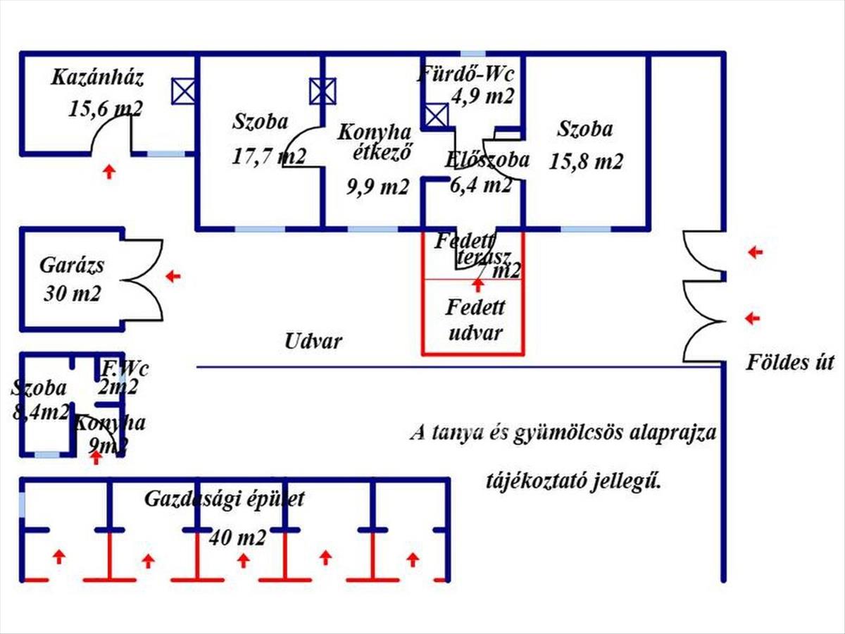 A tanya területén egy 20 m2 nagyságú, szoba-konyha-fürdőszoba elosztású kis épület is áll, egy 30 m2 nagyságú garázs, valamint egy 40 m2 gazdasági épület.