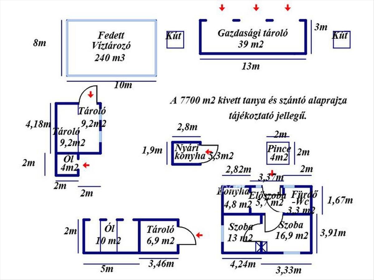 Bács-Kiskun vármegye, Lajosmizse külterületén kivett tanya és szántó megnevezésű ingatlan 45 m2 hasznos nettó alapterületű lakó- és gazdasági épületeivel 7700 m2-es telken eladó! Az 1950-ben épült száraz, vegyes falazatú épület stukatoros fa födémmel, fa tetőszerkezettel és hullámpala héjazattal készült, a homlokzat jó állapotú, festett. a lakóépület két szobából, egy konyhából, egy fürdőszoba-WC helyiségből és egy előszobából áll. a helyiségek beton-, járólap- és pvc borításúak. a külső- és belső nyílászárók normál fa szerkezetűek. a közművek közül az ingatlanban az egyfázisú villany (16 Amper) rendelkezésre áll, emellett két házi vízművel ellátott fúrt kút is található. a víz-ellátás az épületben bevezetésre került, emésztő az udvaron kiépített. a tanya területén több gazdasági épület, két tároló, egy nyári konyha, állattartásra alkalmas ólak, 40 m2 nagyságú terménytároló, egy 240 m3 nagyságú fedett víztározó, valamint egy 4 m2 nagyságú pince is rendelkezésre áll. Az otthon melegéről beszerelhető kandalló vagy kályha gondoskodhat, melyhez a vegyestüzelésű kémény kiépített. a melegvíz ellátására villanybojler beszerelésre került. Az ingatlan jelen állapotában kis ráfordítással lakhatóvá tehető.