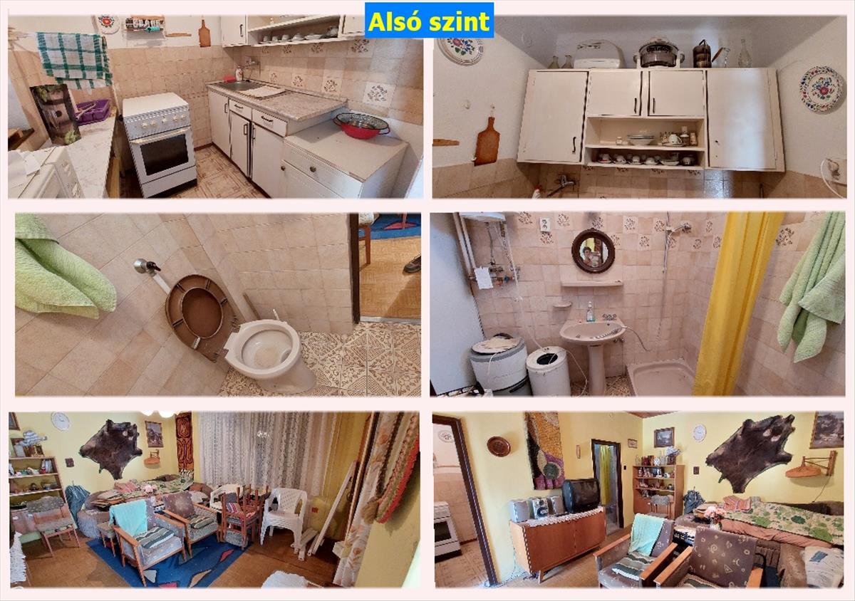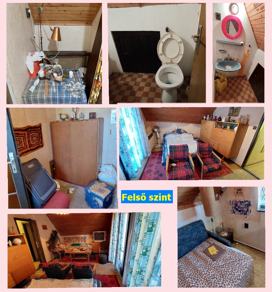 Az alsó szinten nappali, mosdó, konyha. a felső szinten két hálószoba és egy wc van. a padlástér szigeteletlen, beépítetlen. a tető fedése pala, felújításra szorul.