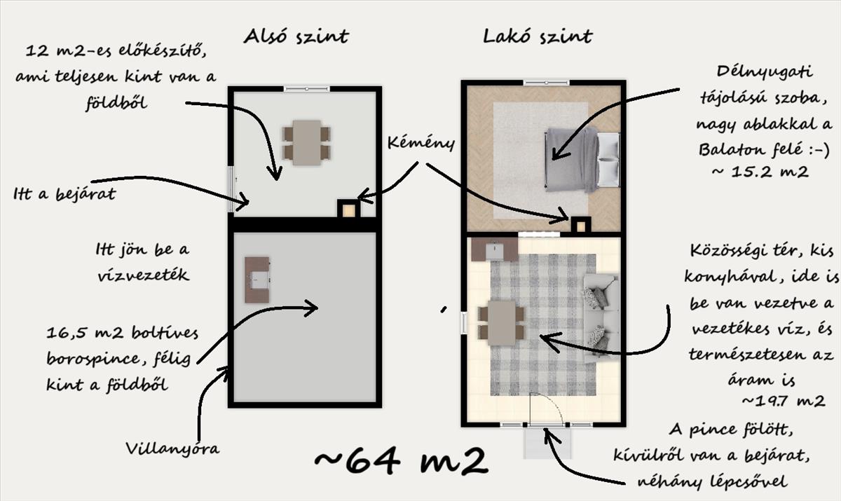 ALSÓ szint: szintén ~32 m2-en boltíves, csodás pince és egy előkészítő helyiség található. a pince félig a földben van, a felső része pedig földdel fedett, de ablakot minden további nélkül lehet rajta nyitni, ha nem borászkodnál:-)