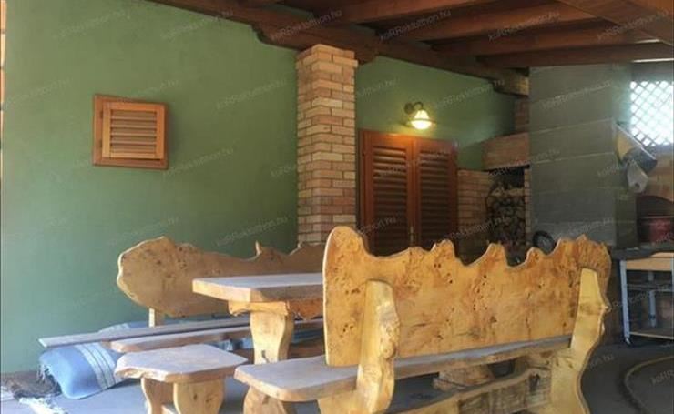Az épületnél két terasz is kialakításra került, egy a ház előtt a másik pedig kerti fa kiülővel a hátsó kertre nézve. a hátsó terasz alatt található egy pince is.