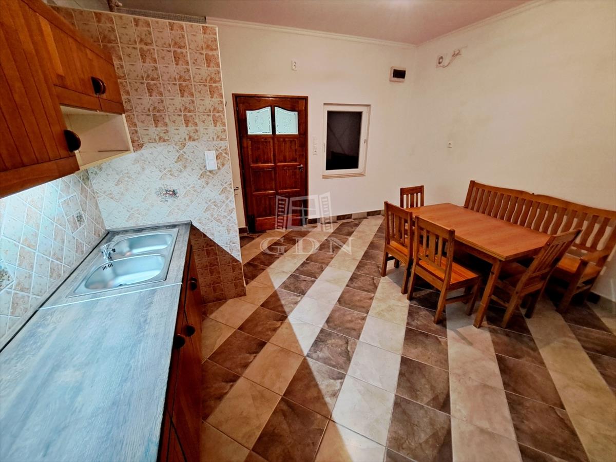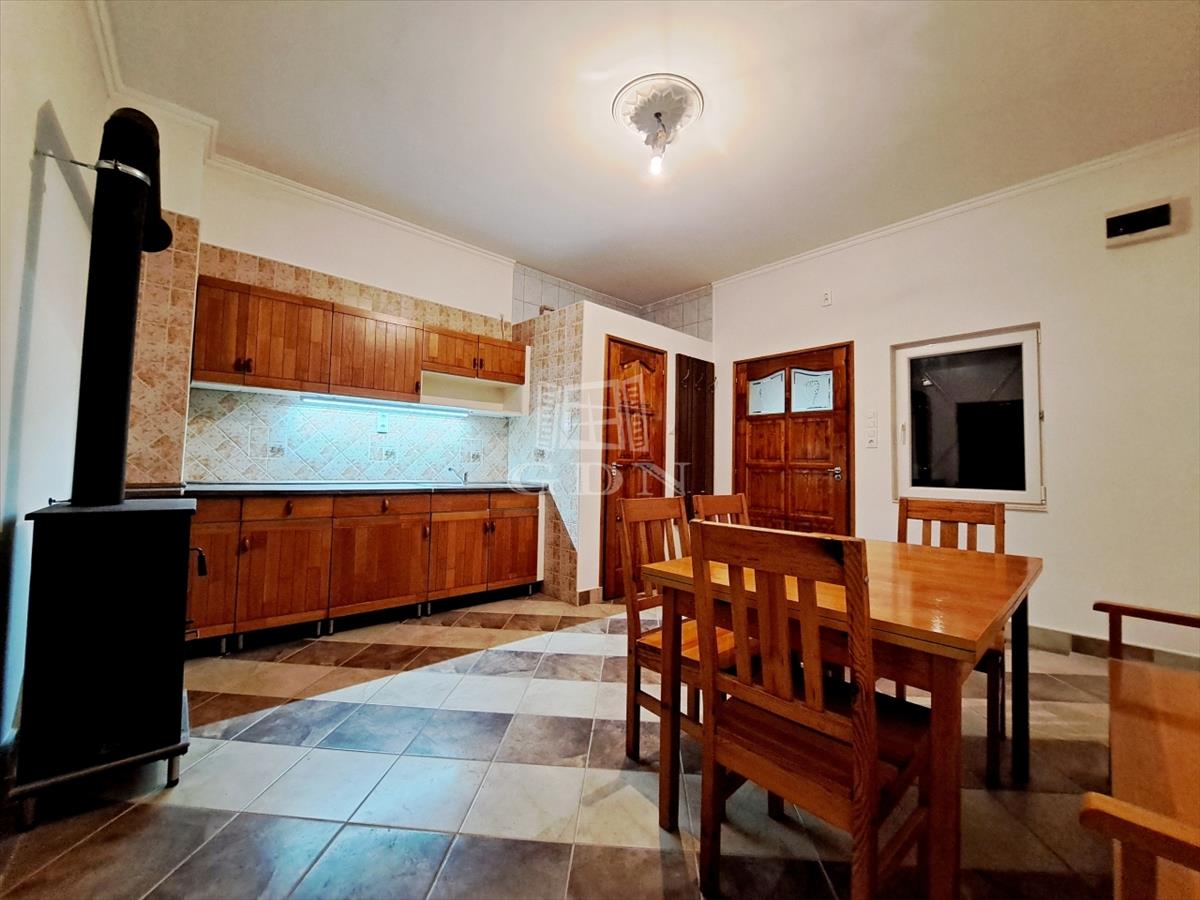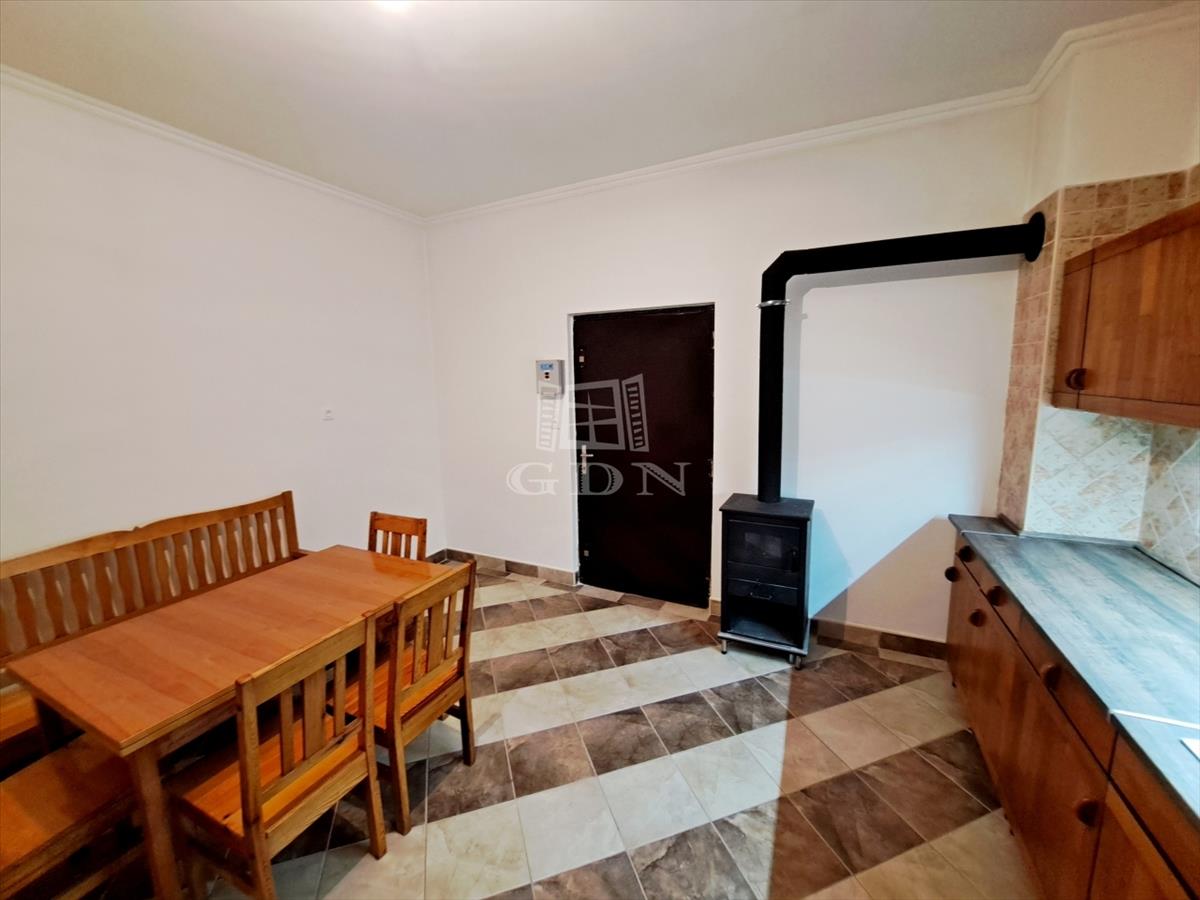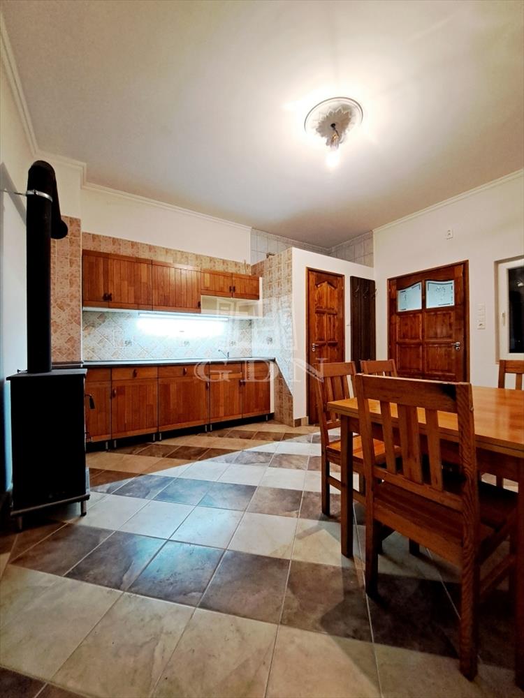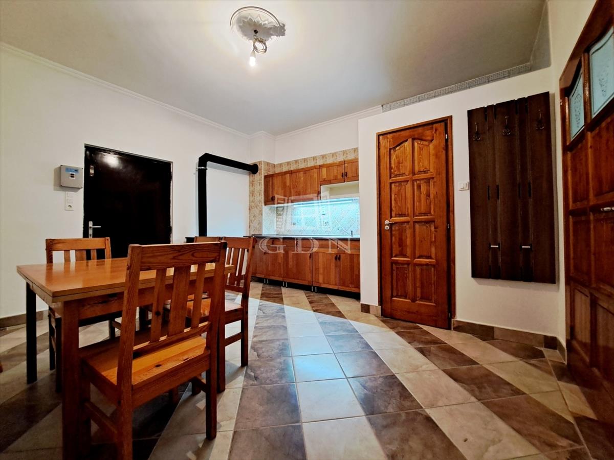 Fa konyhabútor, ebédlőasztal székekkel, vegyes tüzelésű kályha.