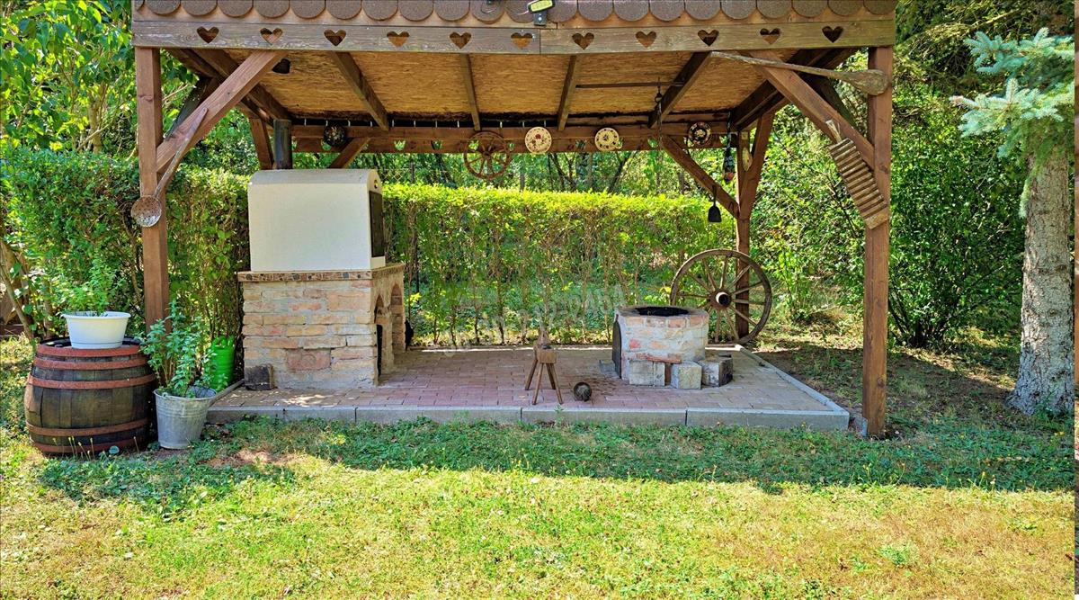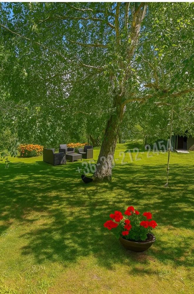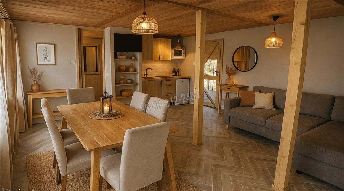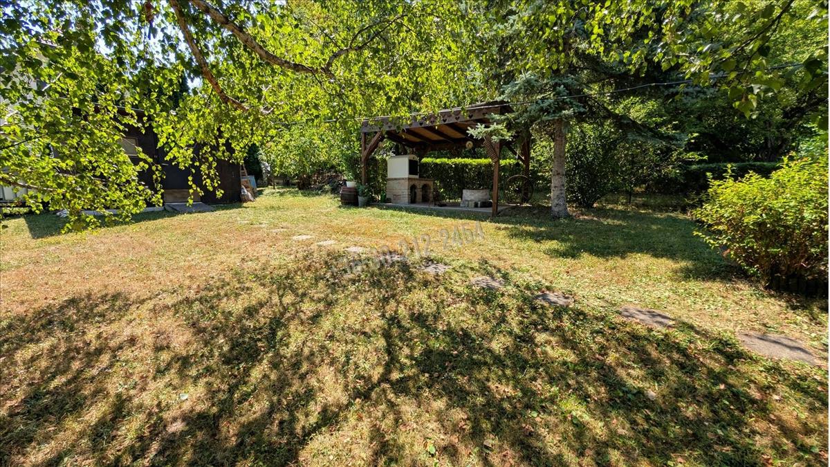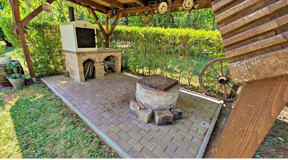 egy 1080 m²-es, parkosított, körbekerített telket, rajta egy bájos, jól kialakított könnyűszerkezetes faházzal, hatalmas terasszal, kemencével, játszótérrel – és végtelen nyugalommal.