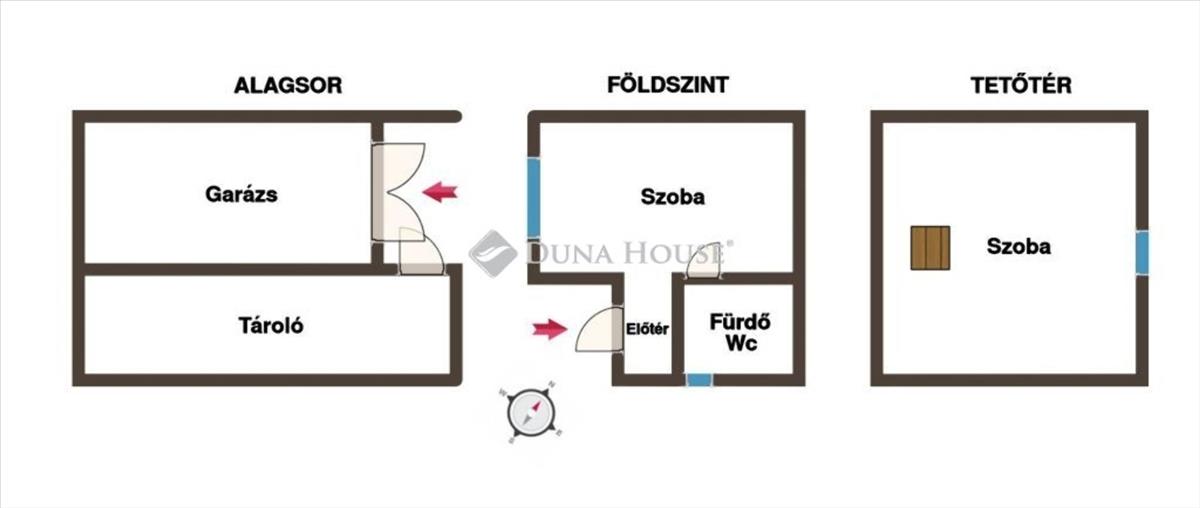 - a kis házban található egy szoba, fürdő-wc, előtér, beépíthető tetőtér, és egy alagsori szint szerelőaknás garázzsal és tárolóval.