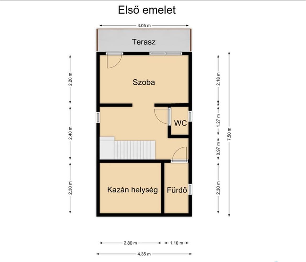 A legalsó szinten amerikai konyhás nappali és étkező kapott helyet, ahol a családdal kényelmesen étkezhetünk vagy kanapén ülve mozizunk. a lépcsőn felfelé az első emeletre érünk, ahol egy hálószoba, fürdőszoba külön mellékhelyiséggel és egy 4 nm-es terasz található. a tetőtér be van építve, itt egy szoba és egy erkély kapott helyett.
