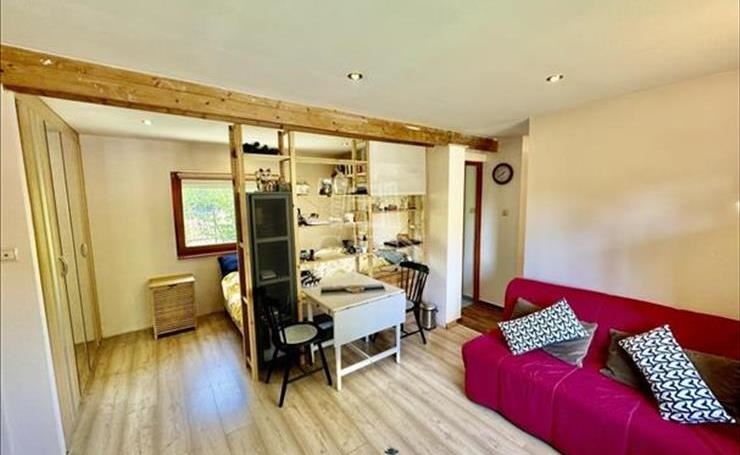 A ház földszintjén található helyiségek: 18, 5 m²-es tágas szoba, amely térelválasztóval kényelmesen nappalivá és hálószobává alakítható úgy, hogy még is megmarad a térérzet.