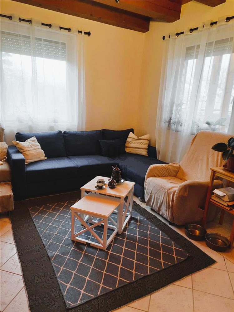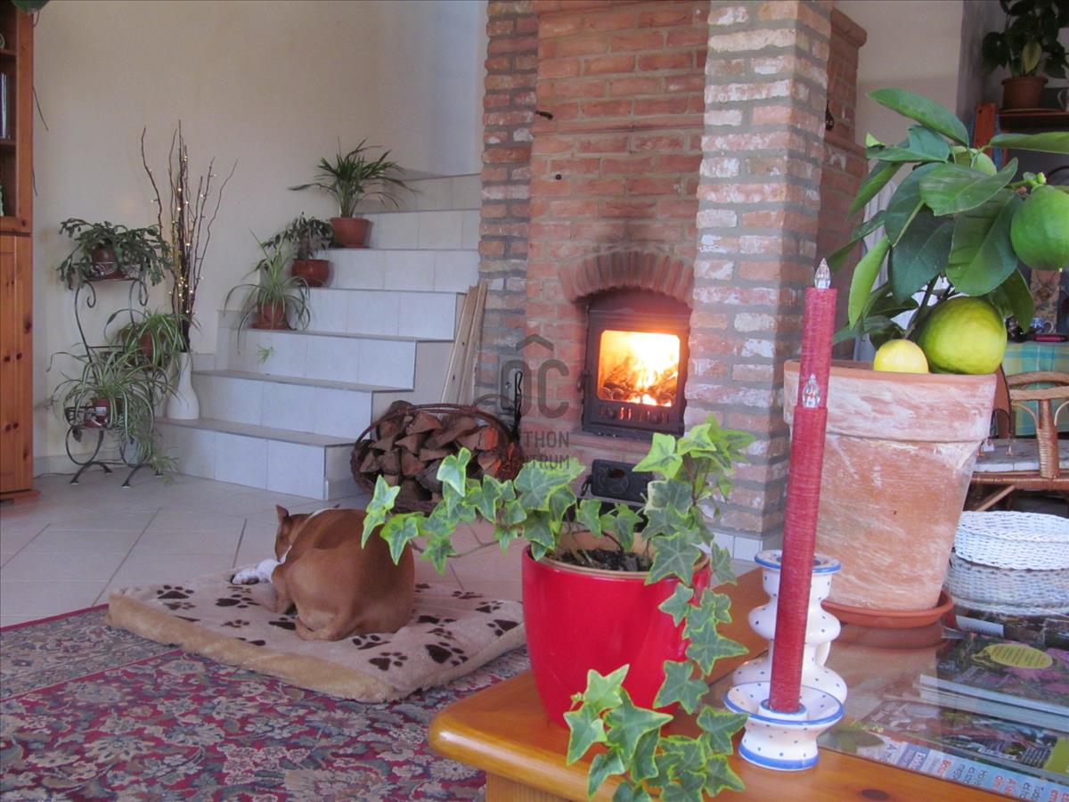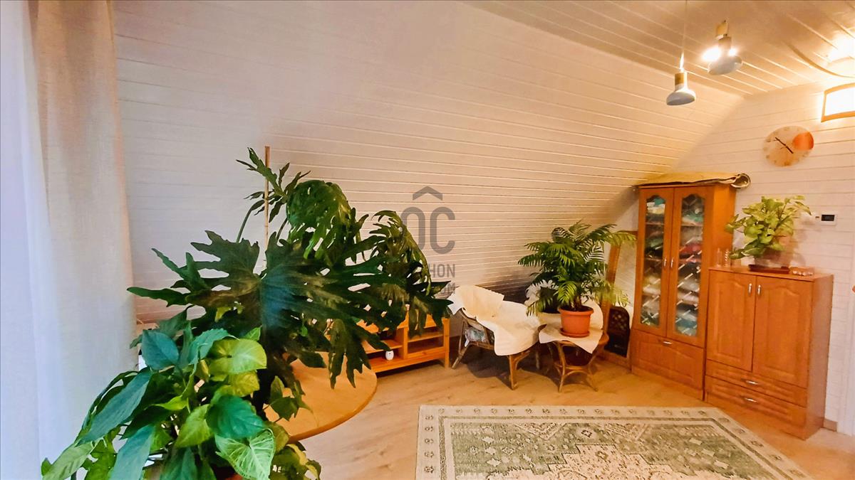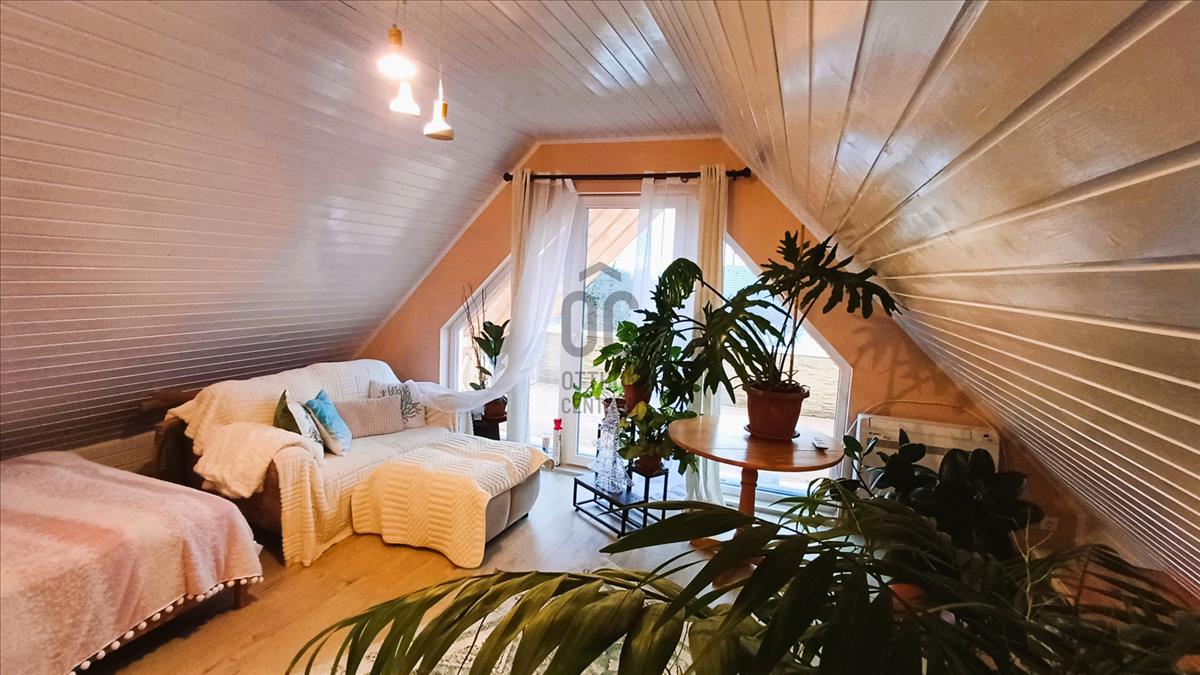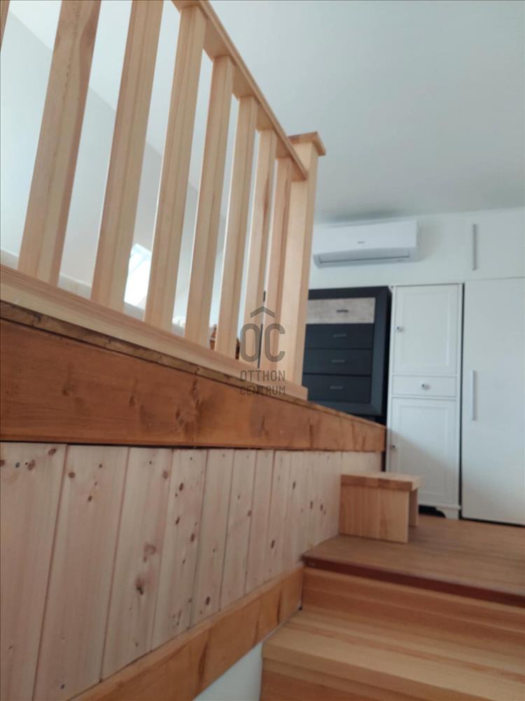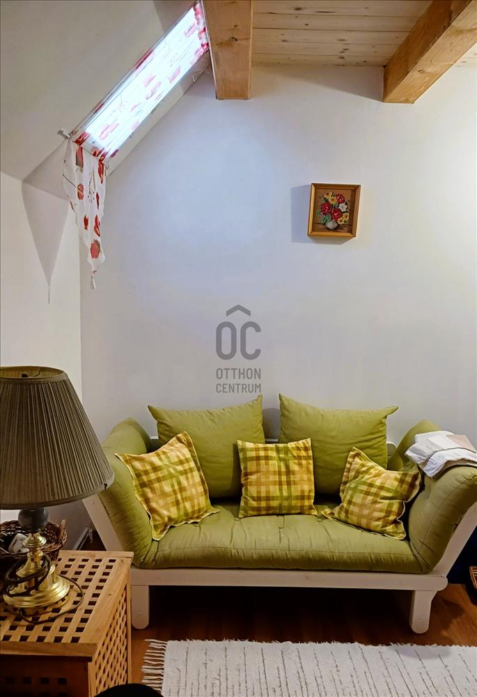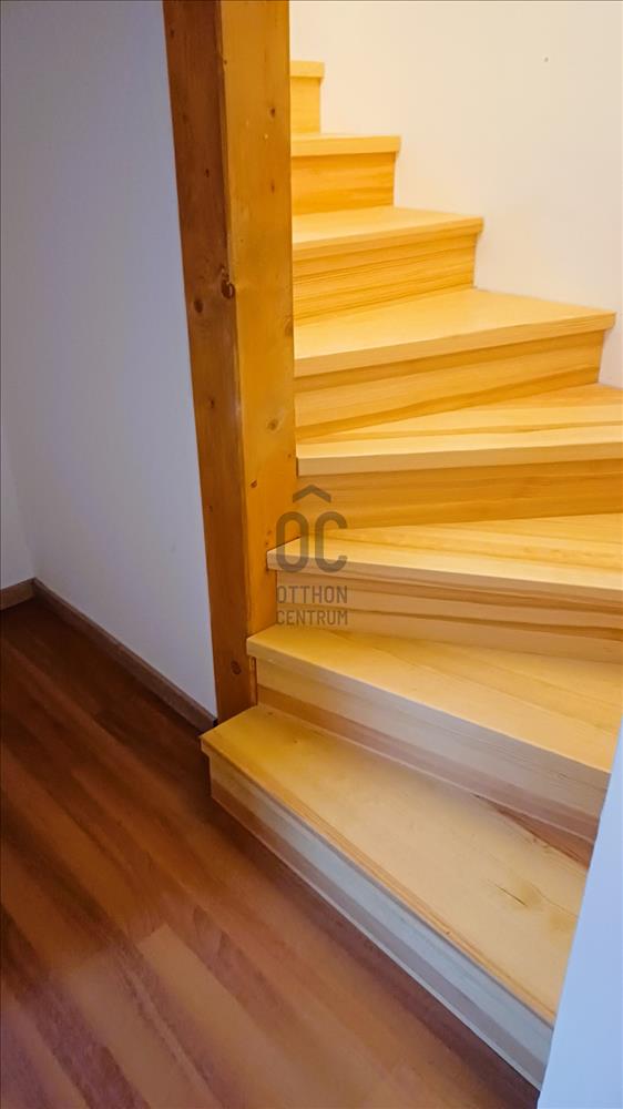 A földszintet L alakú nappali - étkező - konyha foglalja el, valamint fürdő toalettel. Járólapokkal borított lépcső vezet a félemeletig, ahol egy kis közlekedőből hálószoba, hálófülke és néhány további lépcsőfokkal egy háló galéria érhető el. Szép, új falépcső visz a tetőtérbe. Itt a közlekedő egyik feléből egy nagyobb, terasz kapcsolatos háló nyílik, a másik oldalán bájos teakonyha, mögötte fürdő.