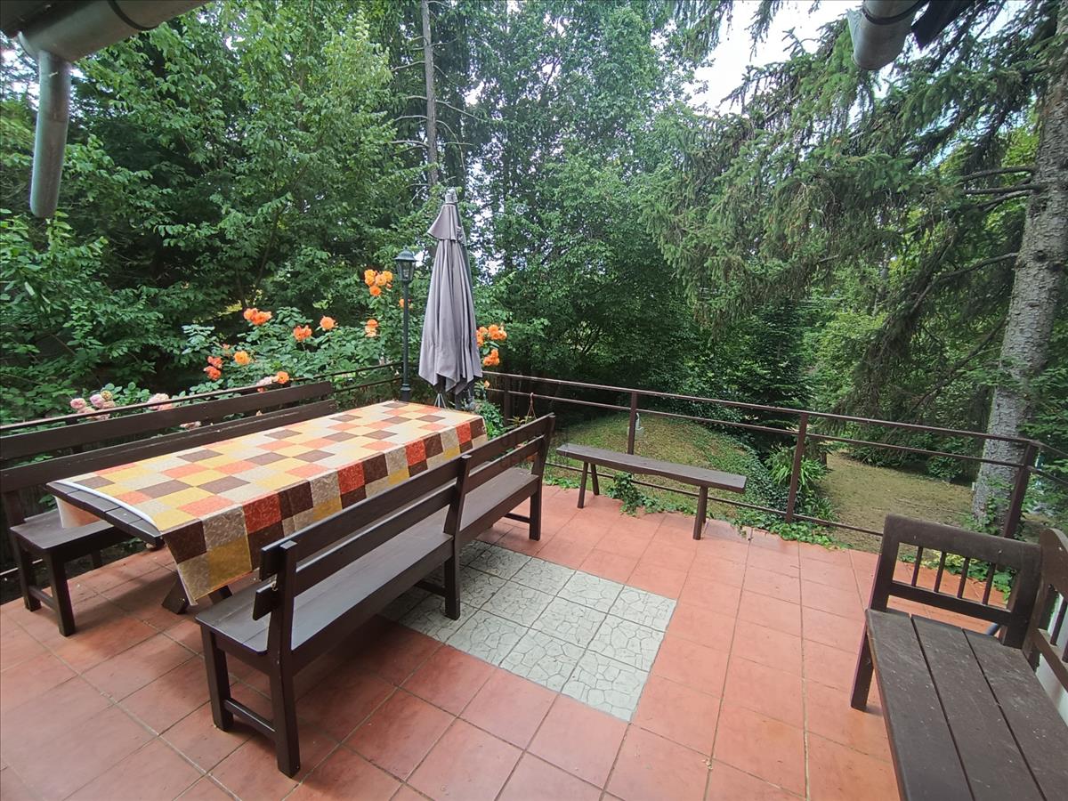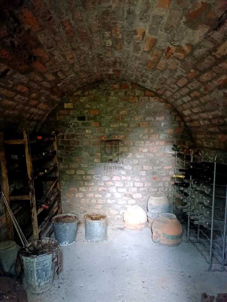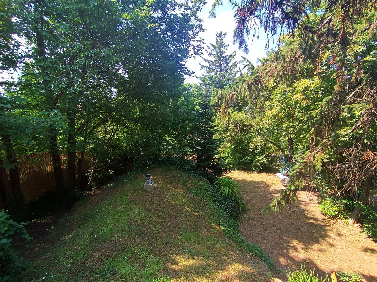 A kertben nagy fák adnak árnyékot, minden oldalról magas örökzöldek védik a házat a kíváncsiskodó tekintetektől. Egy kis földi pince is van itt, amely nyáron is hűvös, tökéletes klímát teremtve a tárolandó boroknak. Az épület mögött egy kis szerszámtároló áll. Garázs nincsen, de a feljárón 3 személyautó kényelmesen elfér.