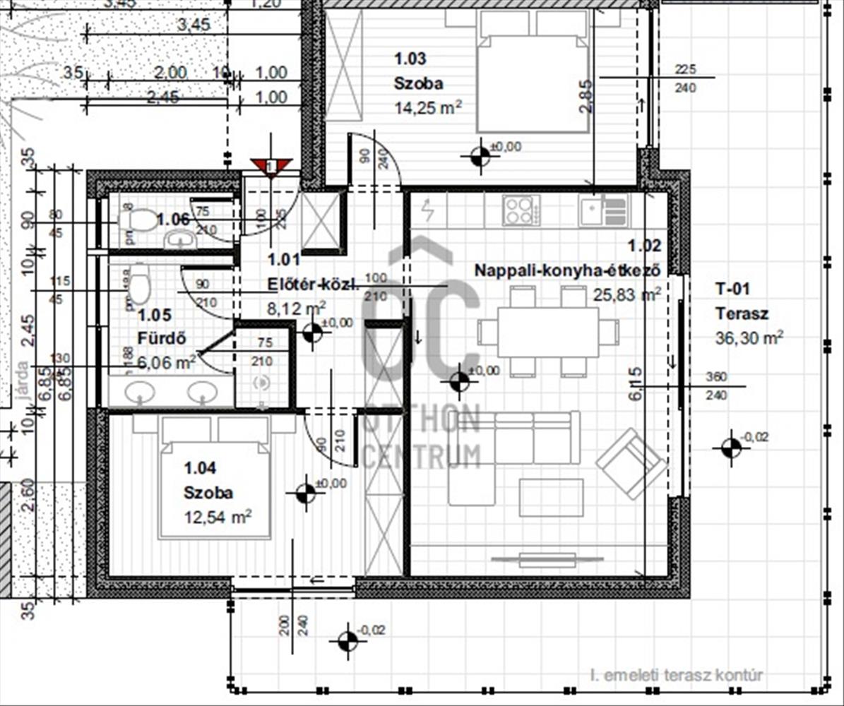 2 hálószoba, nappali, amerikai konyha, előszoba, fürdőszoba +wc, wc, terasz és egy szép nagy kertkapcsolat.