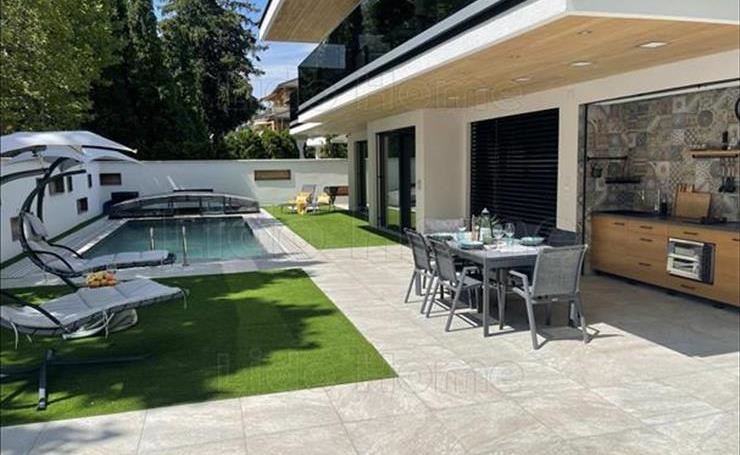 A kertben egy 34 m2-es fűthető úszómedence is helyet kapott, mellette pedig egy nyárikonyha is kialakításra került. Az udvarban parkolási lehetőség van több autó számára is. Az telek műfűvel borított és jelenleg is folyamatos karbantartás alatt áll.