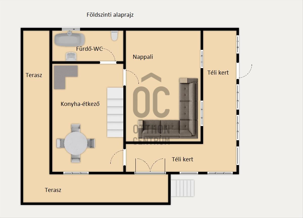 Lakótér: 3 tágas szoba, amerikai konyhás nappali, télikert