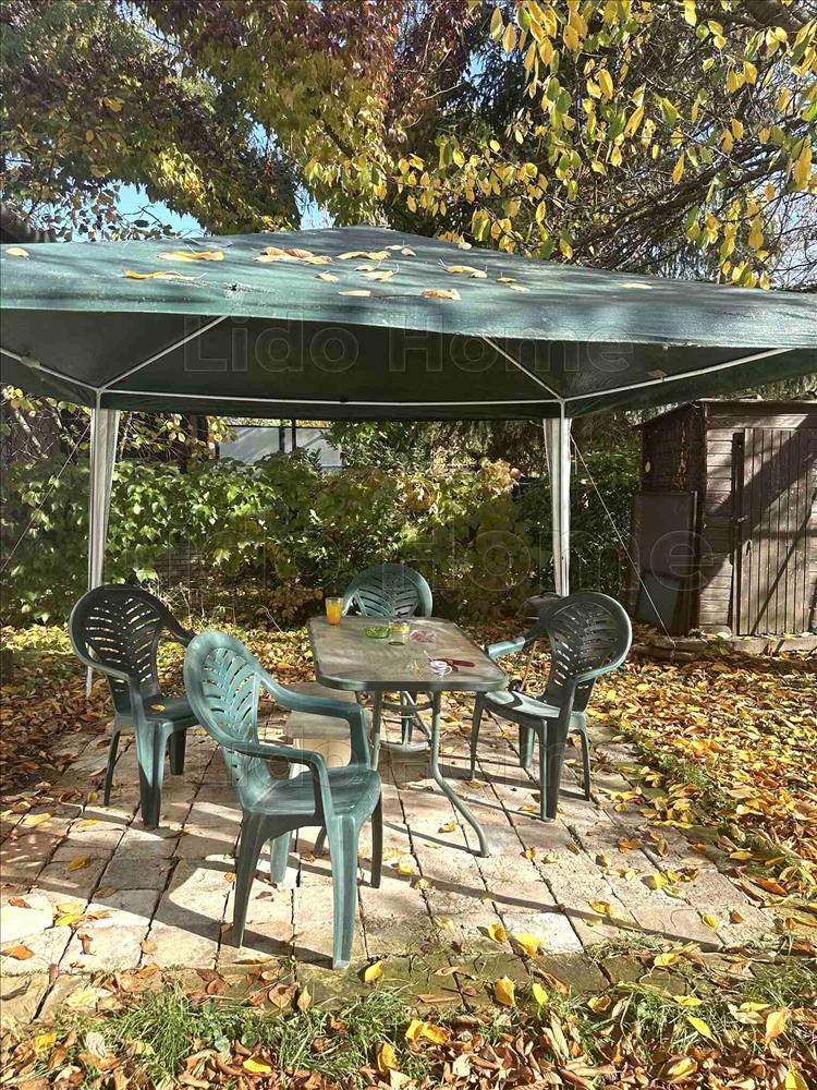 -Téglából épült, fa kerti tároló, kertben több termő és árnyékot adó gyümölcsfa van, dió, cseresznye.