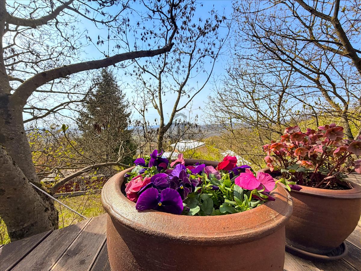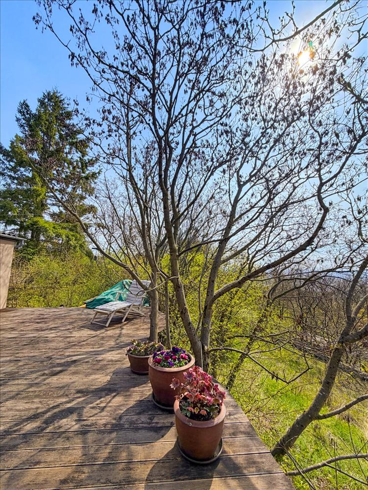 A kert fele erdőkert jellegű, nagy fenyőfák és kőrisligetekkel, a másik fele mezei virágos, kellemes, tervezhető kert és annak gazdag zöld növényzete, színes virágai, az ősfákkal körbe ölelt terasz. . . a káprázatos panoráma!