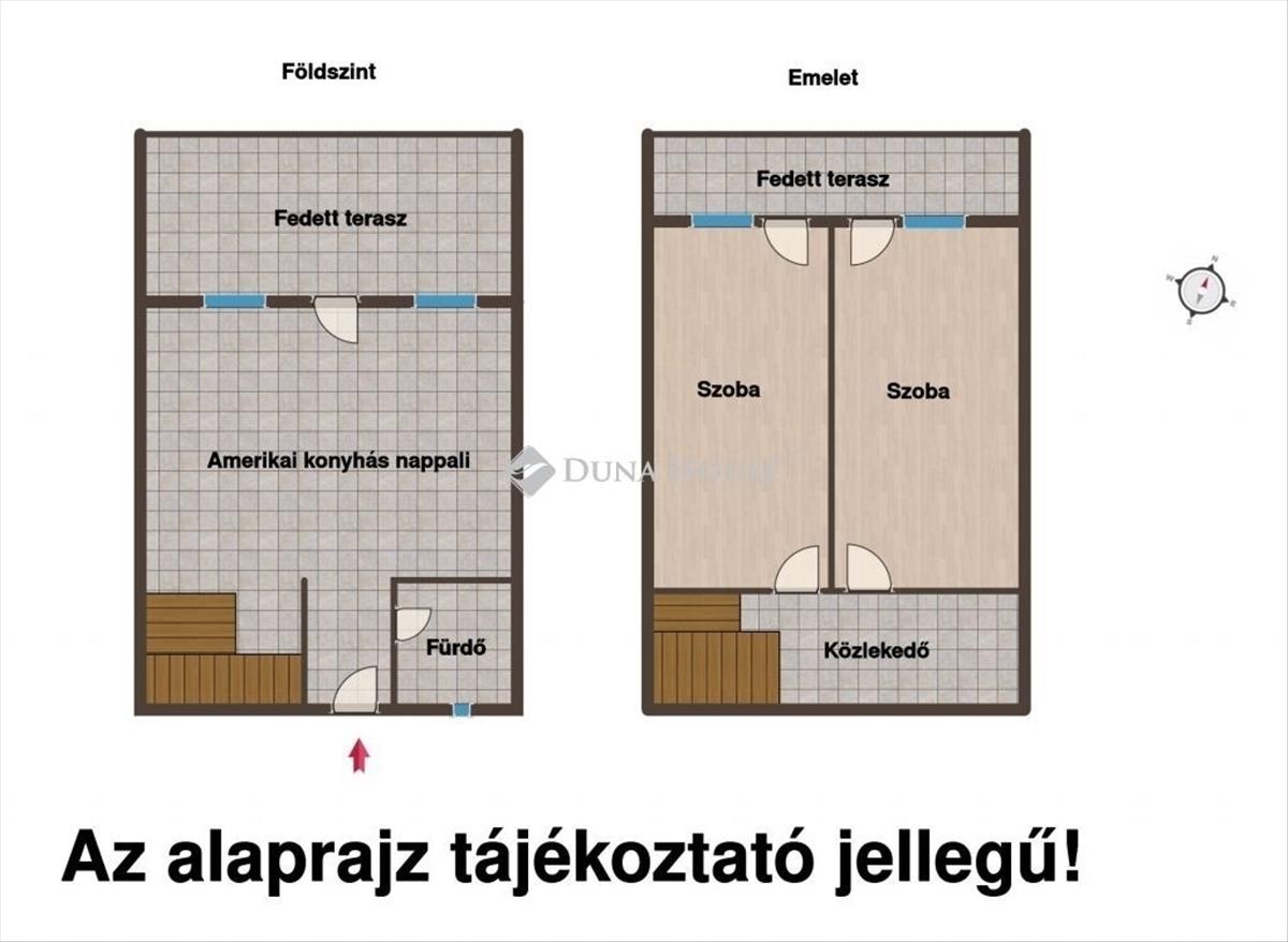 Az alsó részen egy amerikai konyhás nappali és egy fürdőszoba található. a felső szinten pedig 2 szoba és egy közlekedő került kialakításra.