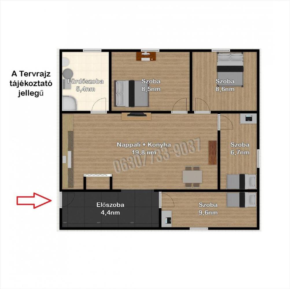 Elrendezés: 4 szoba + nappali-konyha egyben