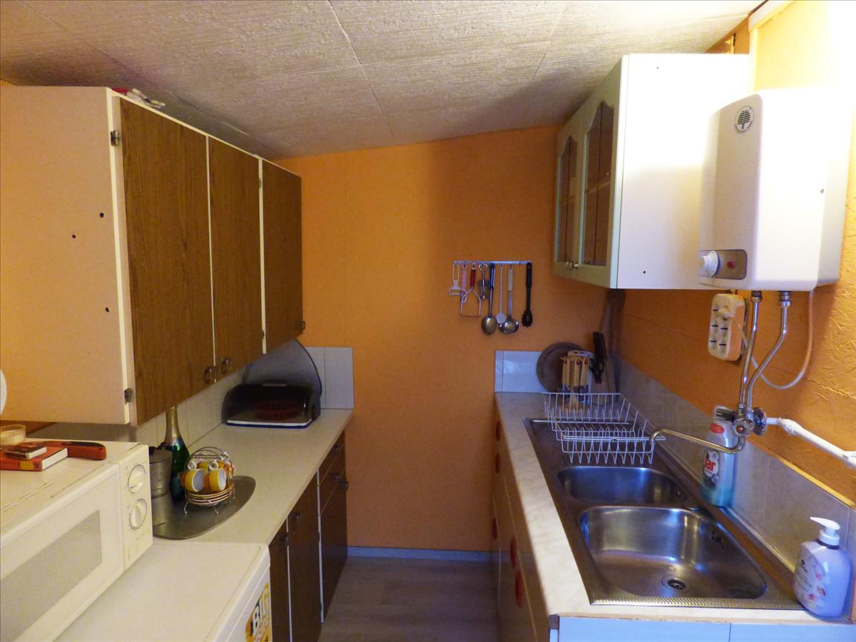Az 5 nm-es konyha a nappali mellett található, külön bejárattal rendelkezik. Felszerelése gáztűzhely, hűtőszekrény és mikróhullámú sütő. Mindez az eladási ár részét képezi.
