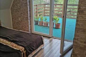 Alsó szinten: terasz, nappali, főzőfülke, zuhanyzós fürdőszoba, lépcsőfeljáró,
