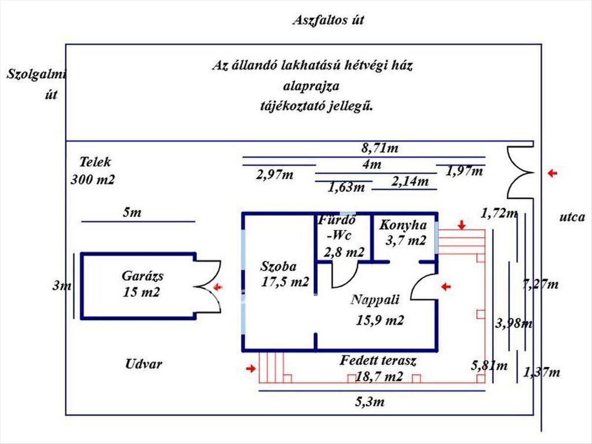 Bács-Kiskun vármegye, Tiszakécske-Kerekdombon, a Thermálfürdő közelében 39 m2 hasznos nettó alapterületű állandó lakhatásra kialakított hétvégi ház, 18 m2 nagyságú fedett terasszal és 15 m2 nagyságú garázzsal 300 m2-es telken eladó! Az 1980-ban épült ingatlan belterületi besorolású, jelenleg állandó lakhatásra kialakított. Az épület és udvara teljes felújításon esett át. a ház beton alapon tégla falazattal, beton födémen bitumenlemezzel és újraszigetelt lapostetővel készült. a homlokzat kőporozásra előkészített, körben 6 cm hőszigeteléssel ellátott. Az újonnan épített fa teraszfedés héjazata trapézlemez fedést és körben csatornát kapott, járólapos burkolása folyamatban van. a külső nyílászárók és a bejárati ajtó hőszigetelt műanyagra cseréltek, körben redőnnyel és szúnyoghálóval ellátottak. a belső terek elválasztására új műanyag borítású ajtó került beépítésre. a lakóépületben egy szoba, egy nappali, egy konyha, egy fürdőszoba-WC helyiség és egy 18 m2-es fedett terasz kapott helyet. Az ingatlanhoz tartozik még egy 15 m2 nagyságú szabvány lemezgarázs is. a lakóegység helyiségei laminált padló- és járólap burkolatot kaptak. a közművek közül a cserélt belső hálózatú egyfázisú 32 Amper villany-ellátás, valamint a H-tarifás plusz mérő, Fi-relével és körökre rendezett kismegszakítóval, a vezetékes víz-ellátás, valamint az emésztő rendelkezésre állnak. Az otthon melegéről két 3, 5 KWh-teljesítményű hűtő-fűtő klíma, a fürdőszobában elektromos törölköző-szárító gondoskodik. Alternatív megoldásként egy vegyestüzelésű kémény is megépítésre került. a ház melegvíz ellátását egy 49 literes villanybojler adja. Az épület keresztben átszellőztethető. Az ingatlan belső bútorzattal és a komplett konyhai berendezéssel együtt eladó. Az udvar igényesen parkosított, térkövezett, murvázott és füvesített, körben bekerített. Gépjárművek behajtására kapubejáró, a védelem szempontjából kamera-rendszer biztosított. Az udvar hátsó részében álló garázs igény szerint elforgatható vagy a telek végében lévő szolgalmi út felőli kapu létesítésével megközelíthetővé válhat. Aszfaltozott út 20 méterre, a tömegközlekedés a főút mentén elérhető, autópálya felhajtó 2-3 km.